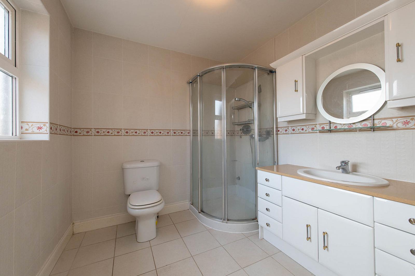 ENSUITE SHOWER ROOM Ensuite shower room with electric controlled shower. Vanity unit. Low flush WC. Extractor fan. Ceramic tiled floor.