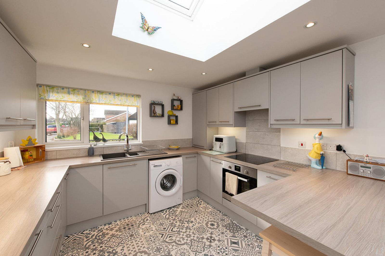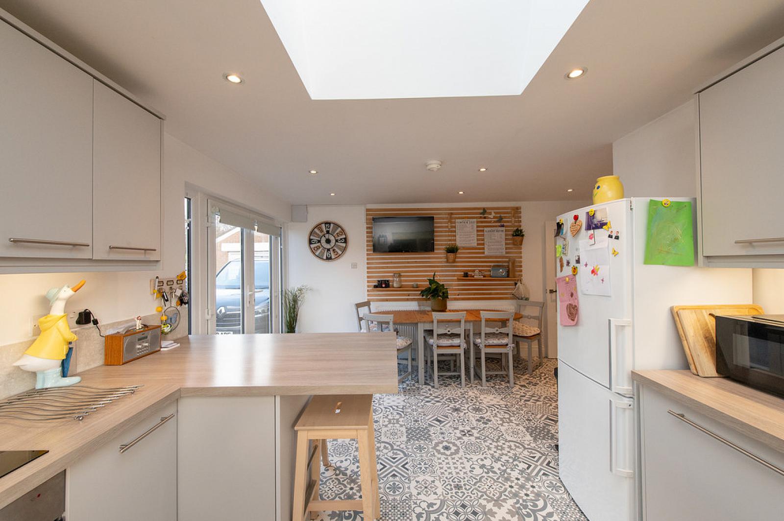Modern fitted kitchen with casual dining area and French doors to side garden