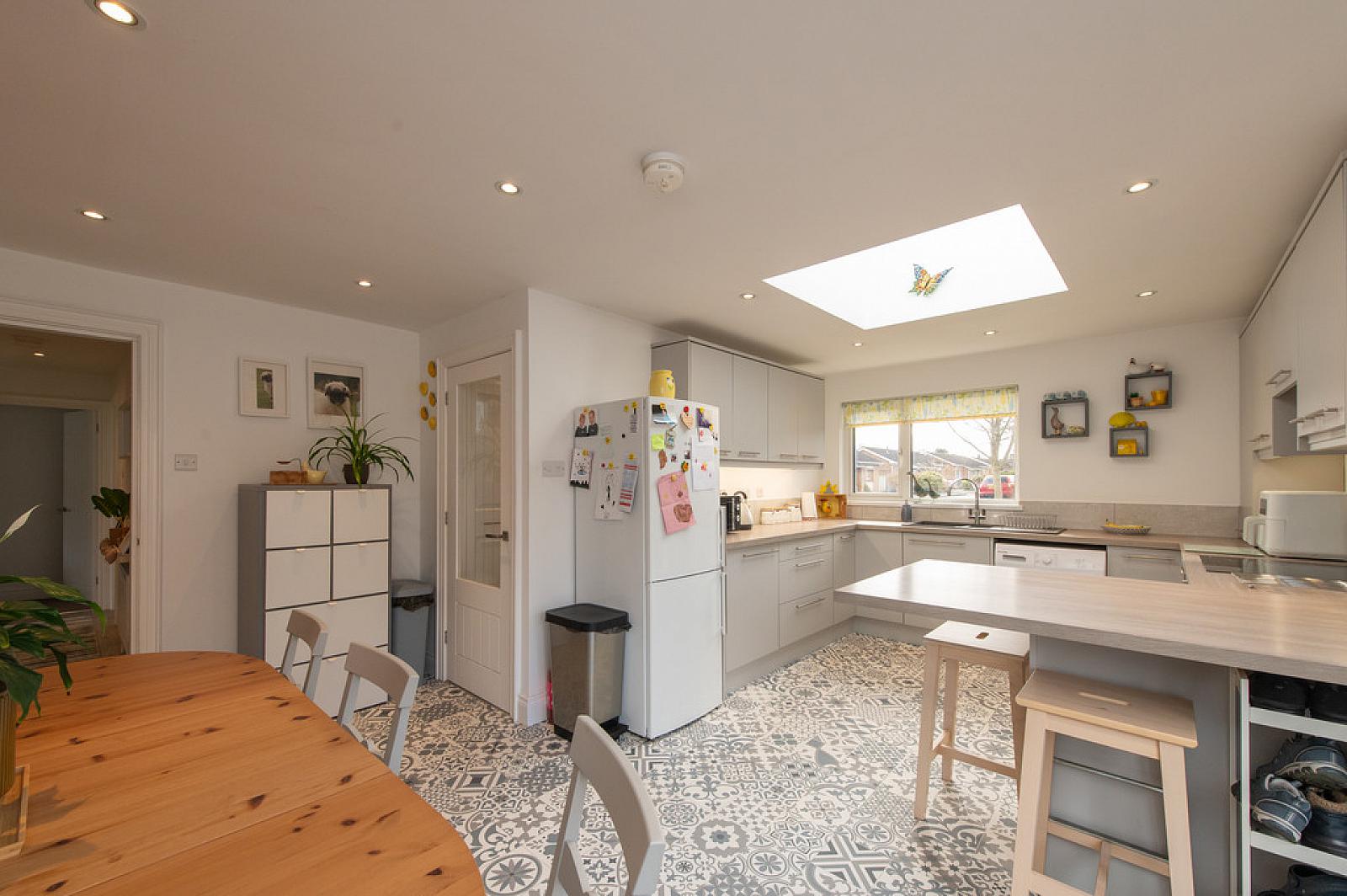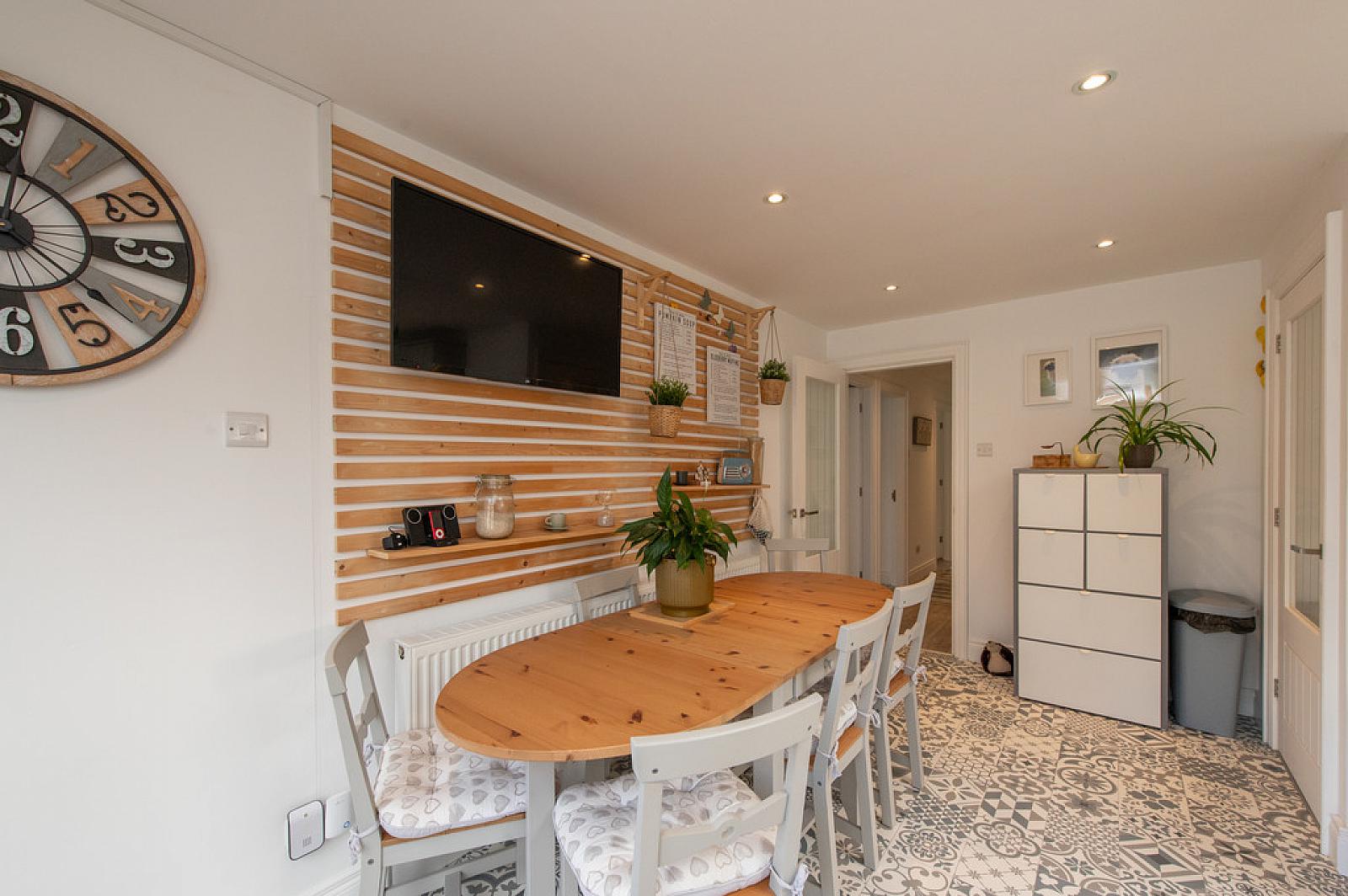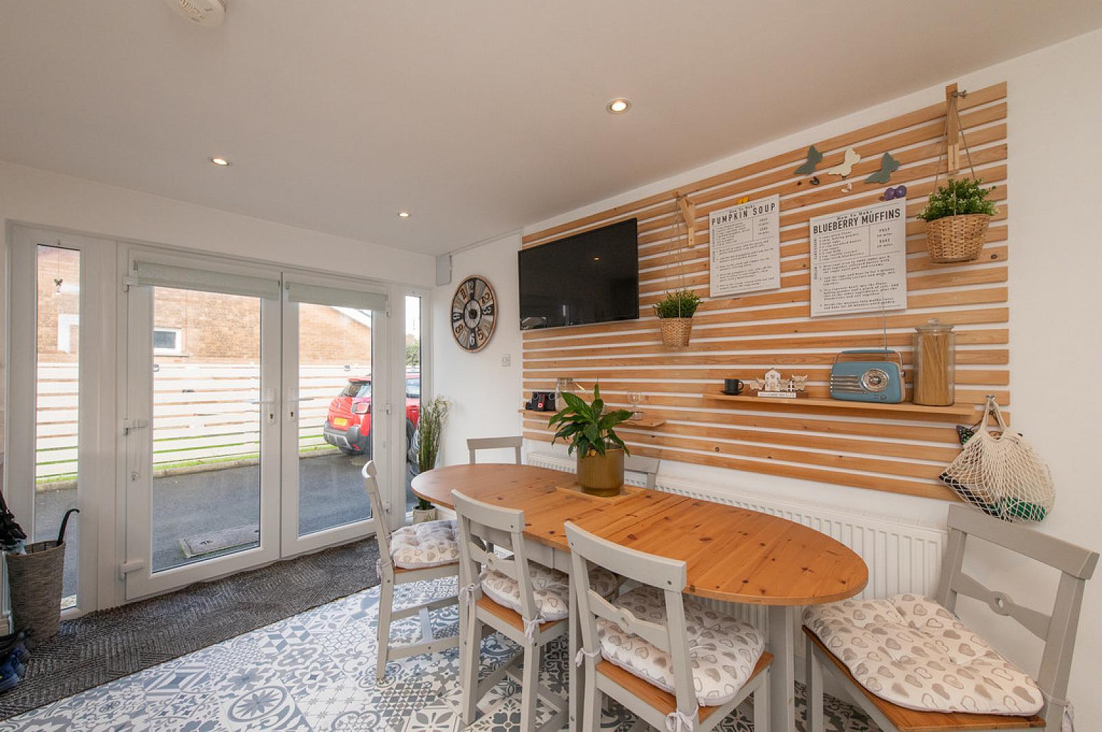 Casual dining area, feature roof light/ Velux window, downlighters, French doors to side.