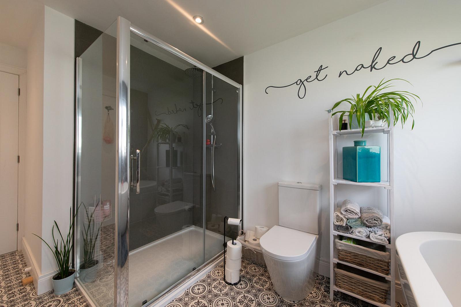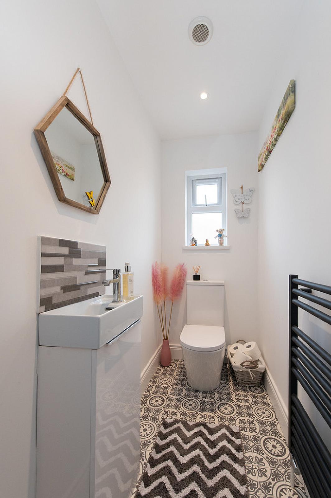 CLOAKS Low flush W/C, vanity unit with mixer tap, heated towel rail, downlighters, extractor fan