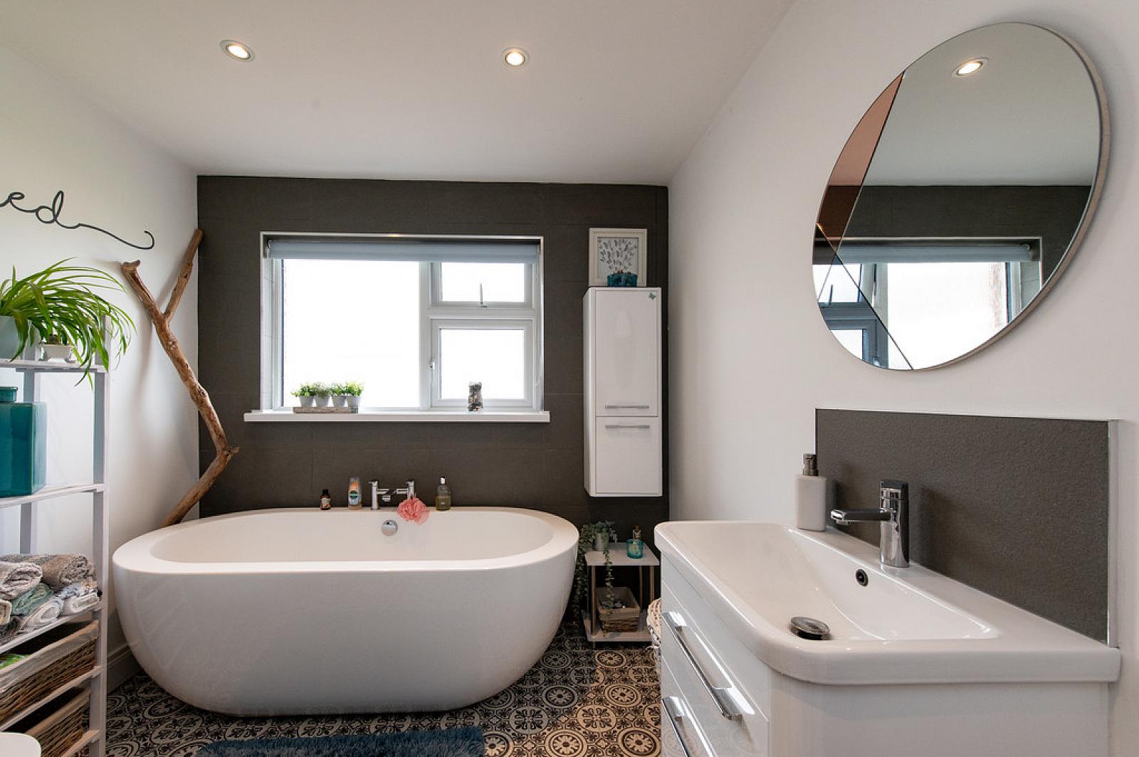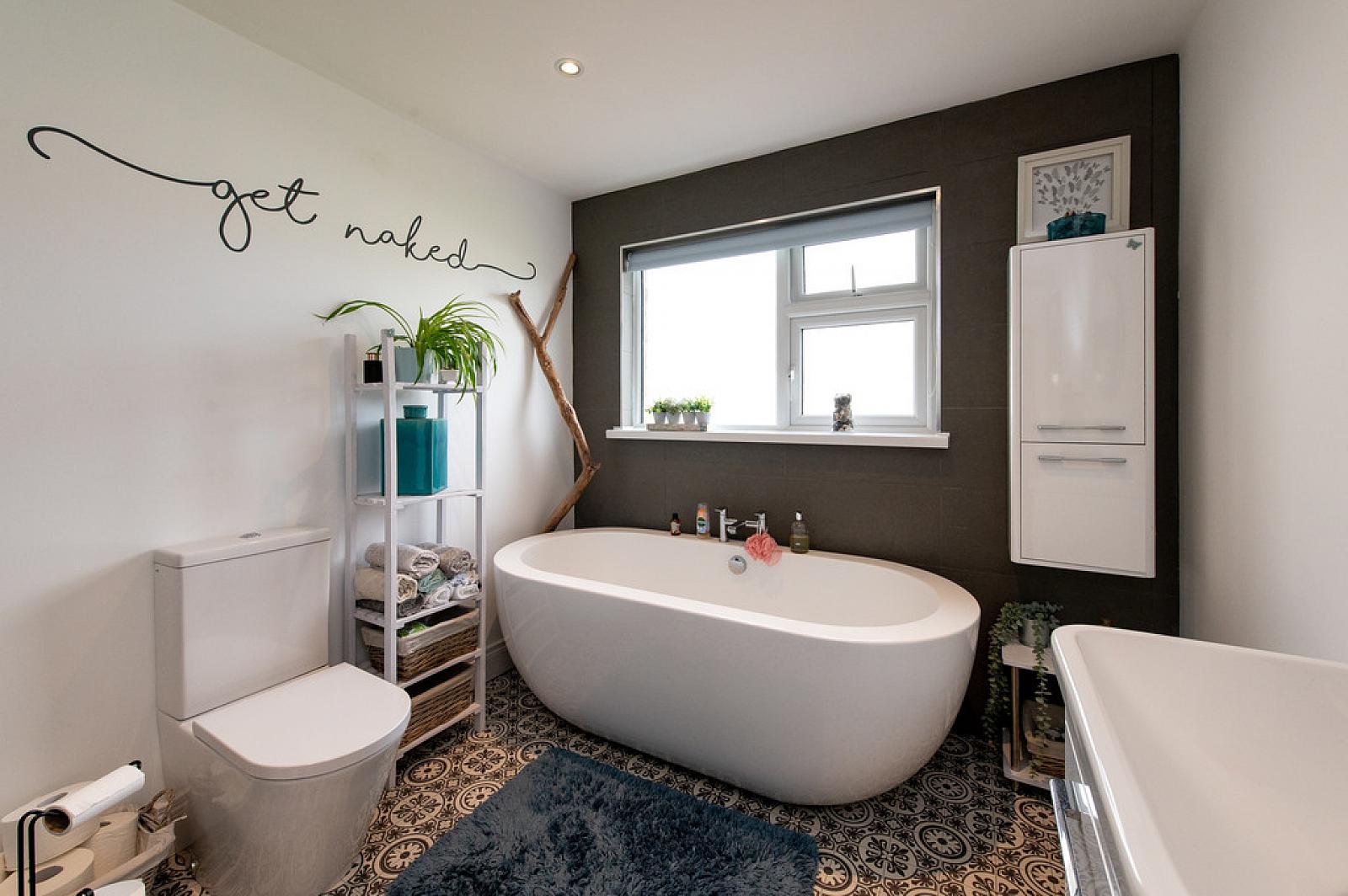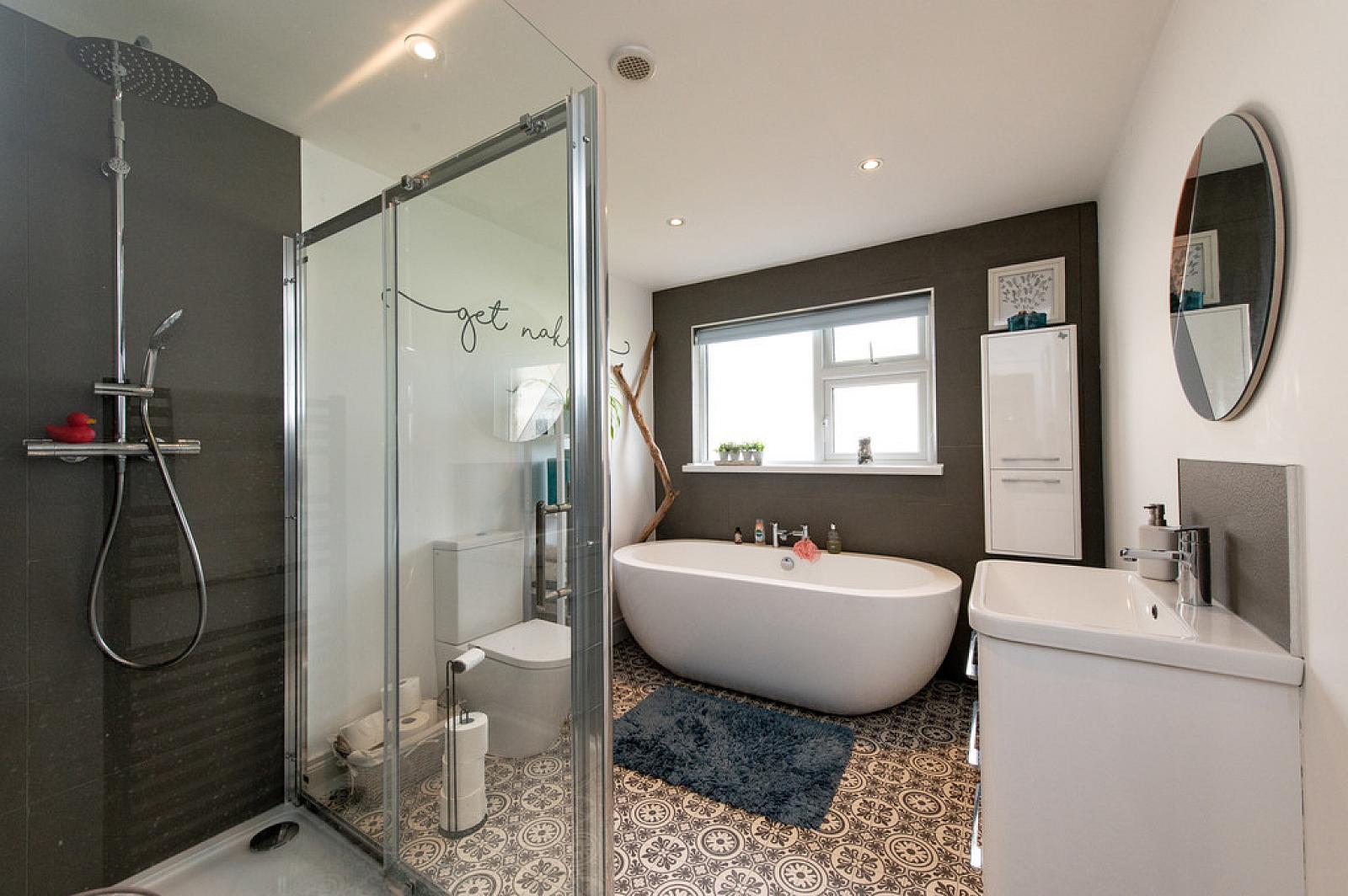 BATHROOM Luxury white bathroom suite, low flush W/C, vanity unit with triple drawers, large shower unit with rain shower, roll top bath with mixer tap, wall hung wash hand basin, downlighters, heated towel rail