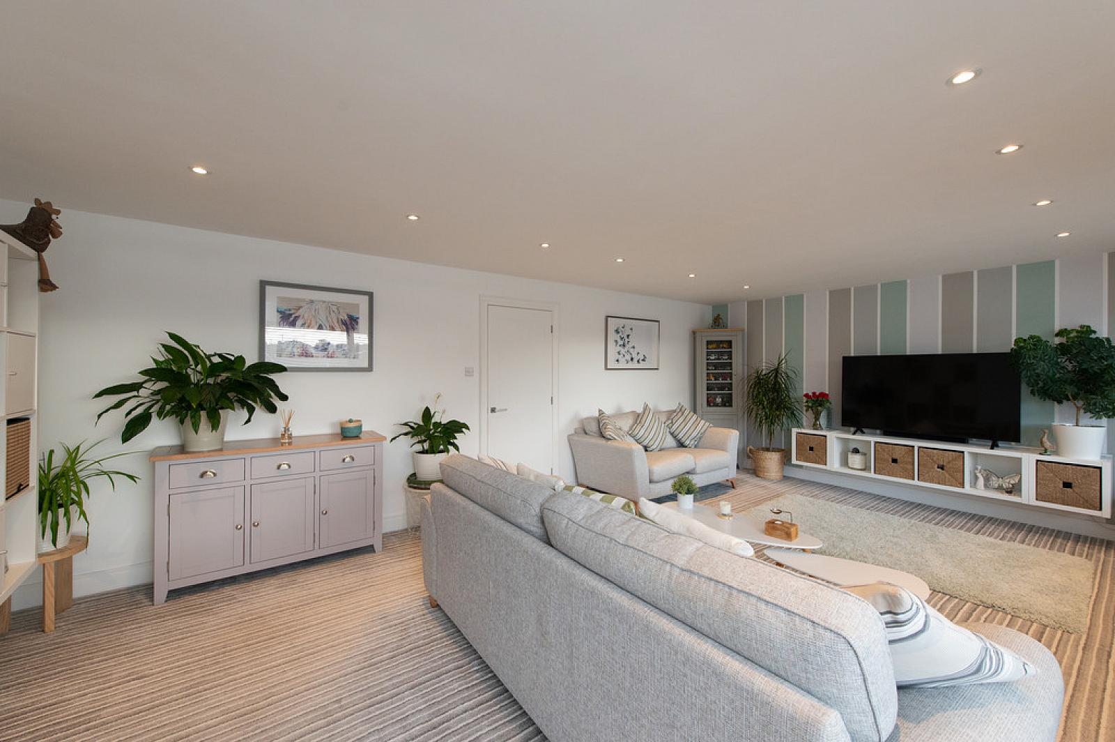 KITCHEN 18' 3" x 14' 8" (at max) (5.56m x 4.47m) Modern fitted kitchen with range of high and low level units, round edge worksurfaces, ceramic sink unit with mixer tap and vegetable sink, built in hob and built in fan assisted oven, extractor fan, wired for flat screen, plumbed for washing machine, Ideal gas boiler.