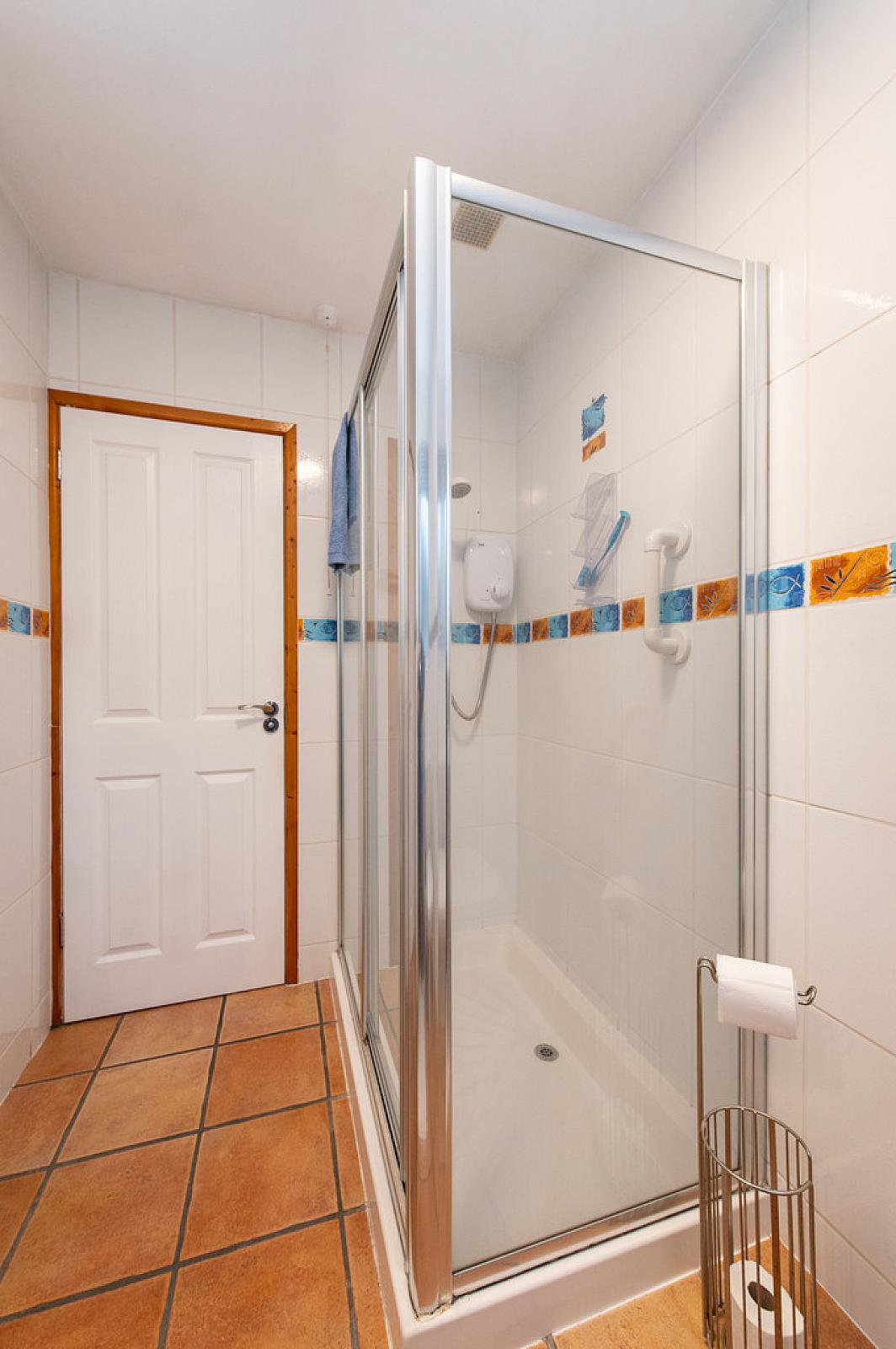 SHOWER ROOM Low flush W/C, vanity unit, shower unit, electric shower, ceramic tiled flooring, fully tiled walls