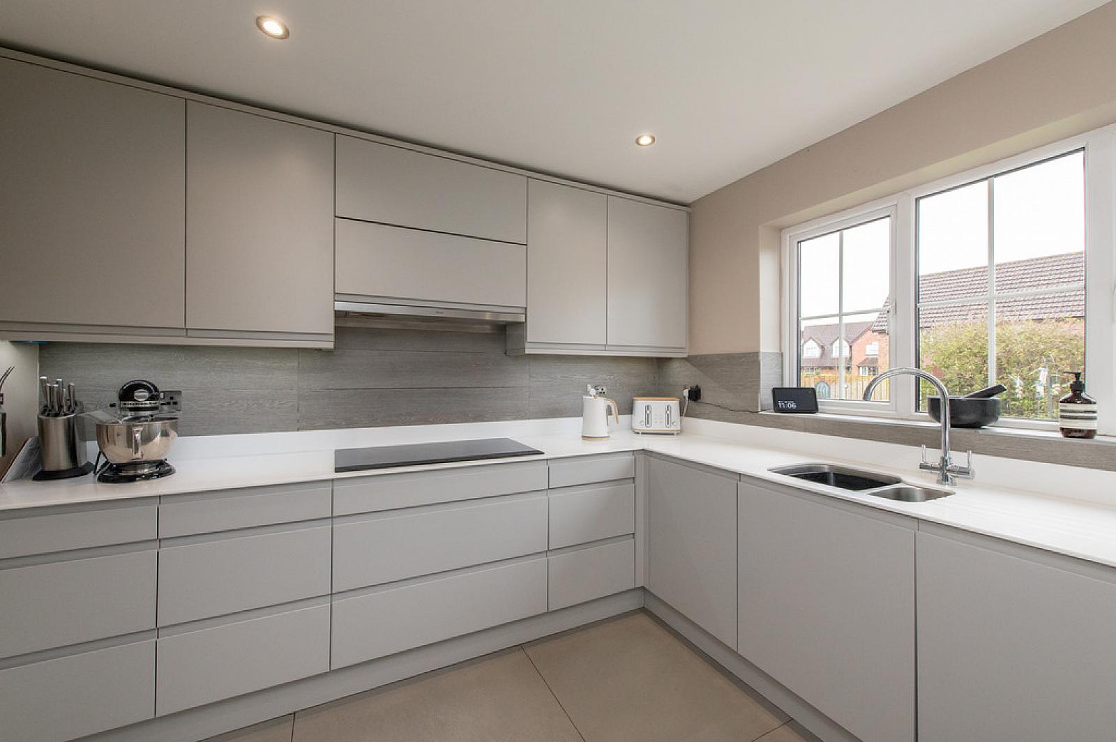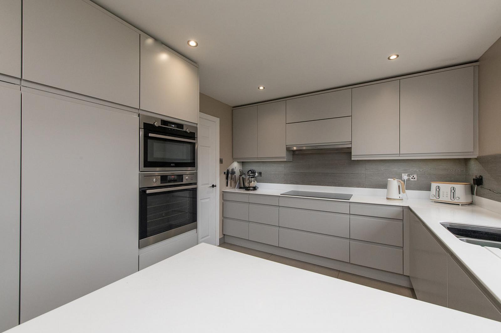 LUXURY KITCHEN 16' 3" x 10' 1" (4.95m x 3.07m) Range of high and low level unit, Corina worksurfaces with upstands incorporating stainless steel sink unit with mixer tap and Corina drainer, built in dishwasher, built in fridge, built in Aeg oven with microwave, built in Aeg fan assisted oven, built in induction hob, extractor fan, luxury floor tiling.