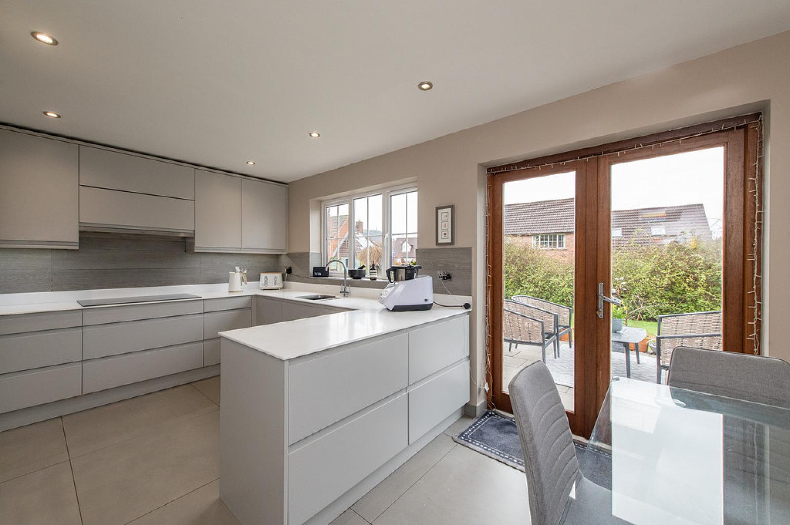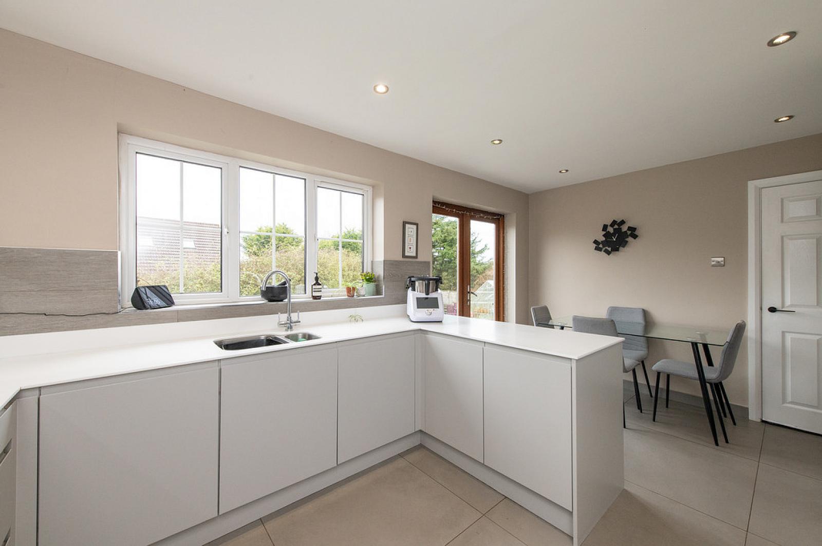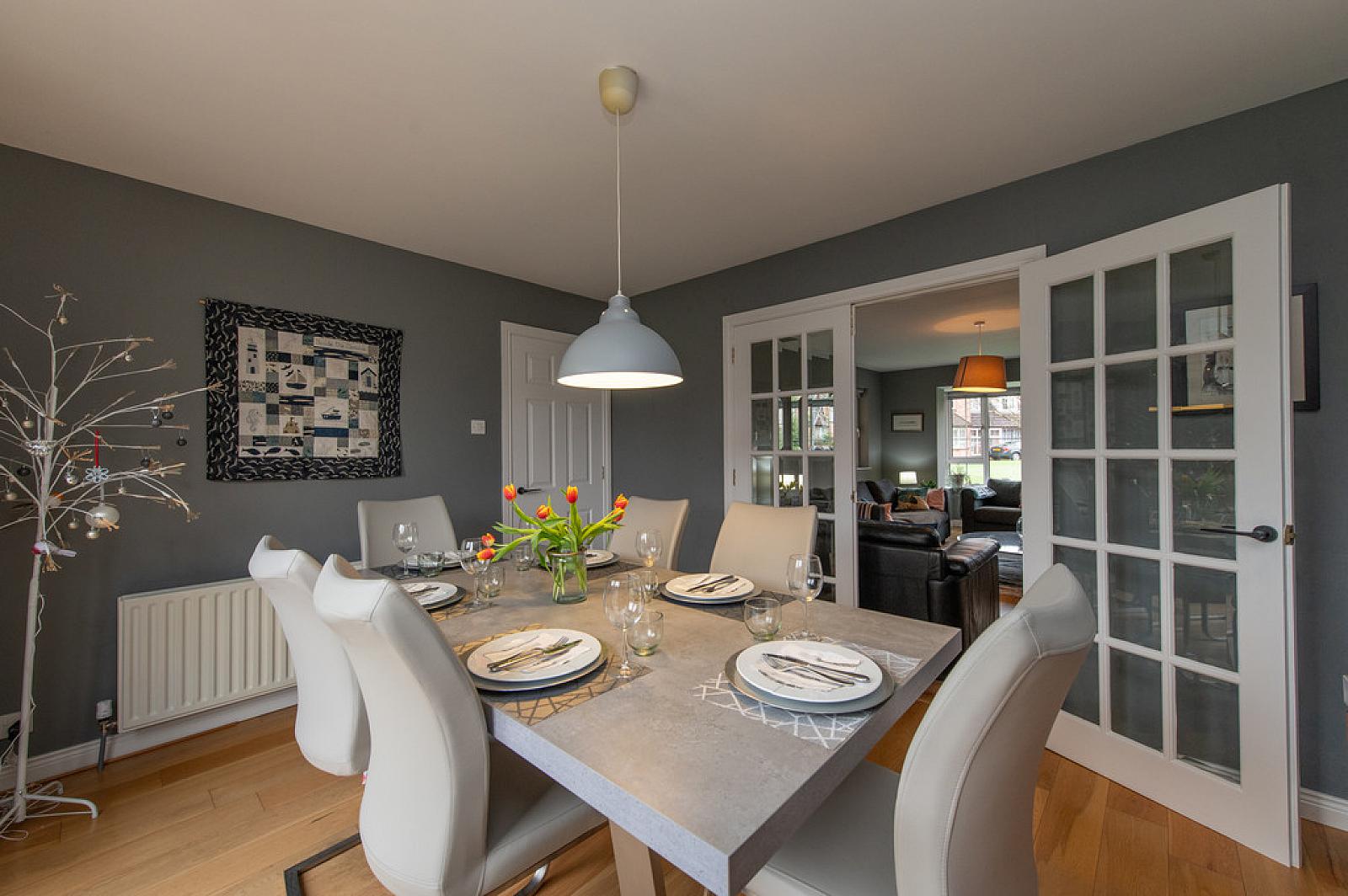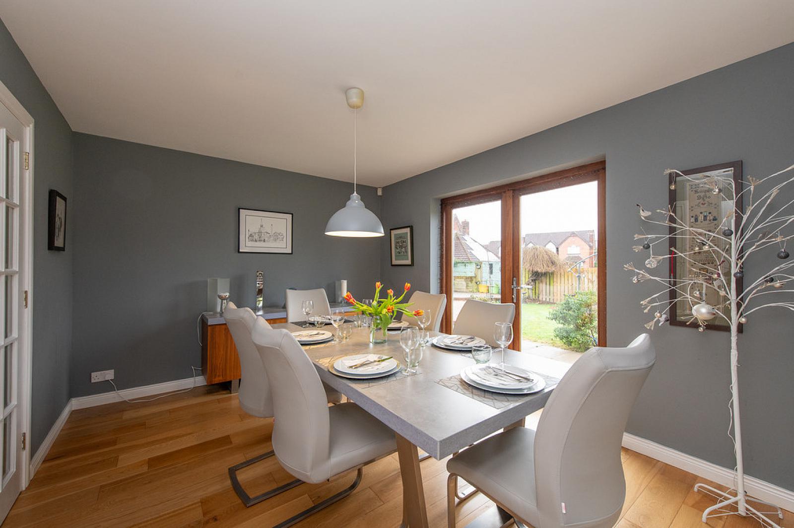 Casual dining area, downlighters, tiling, dimmer, French doors to garden
