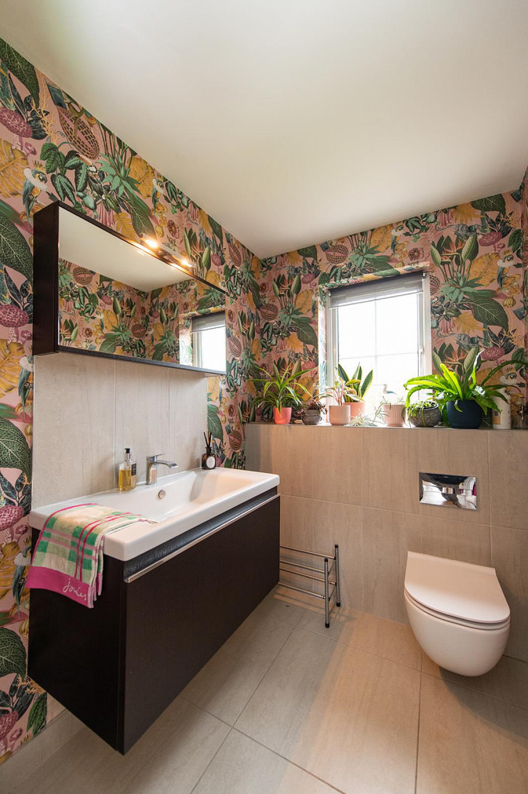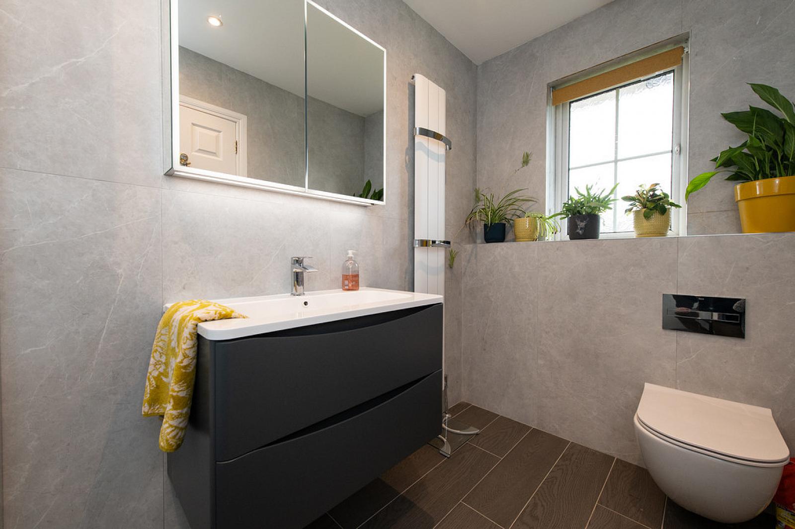 CLOAKS Wall hung W/C, wall hung vanity unit with mixer tap and drainer, tiling, luxury flooring