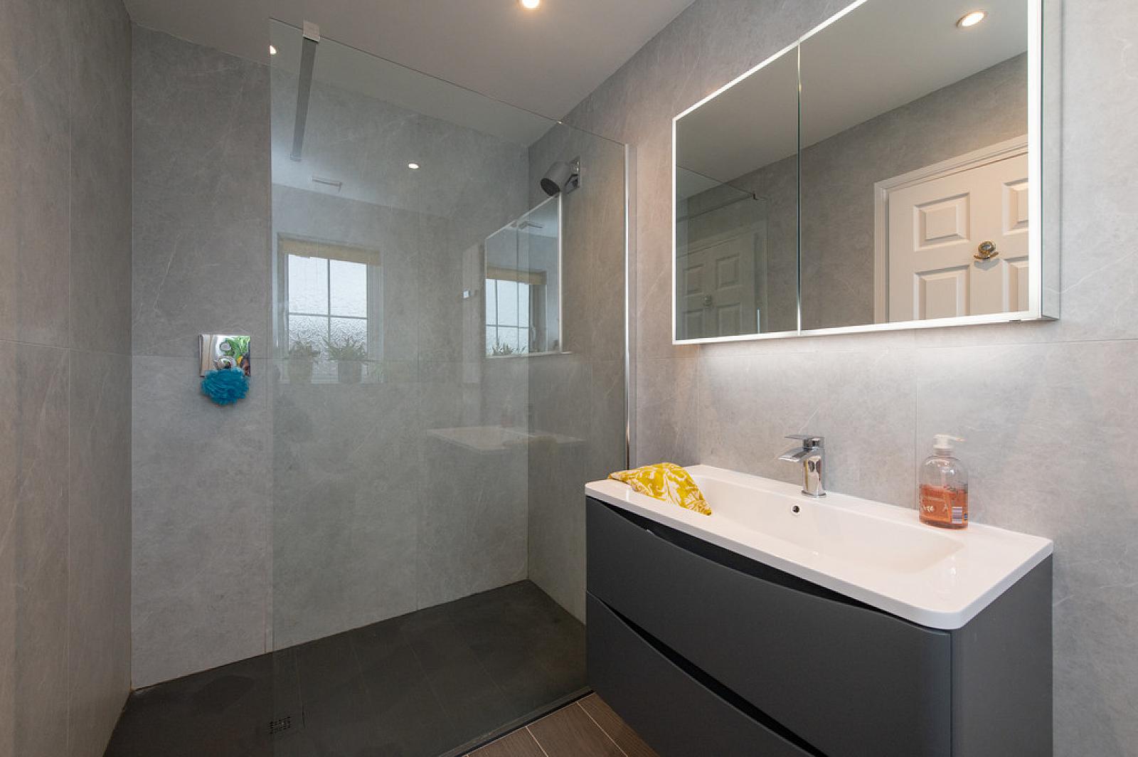 LUXURY ENSUITE SHOWER ROOM Wall hung W/C, wall hung wash vanity unit with mixer tap and twin drawers, walk in shower unit with controlled pressurised shower, heated towel rail, heated mirror with integrated light