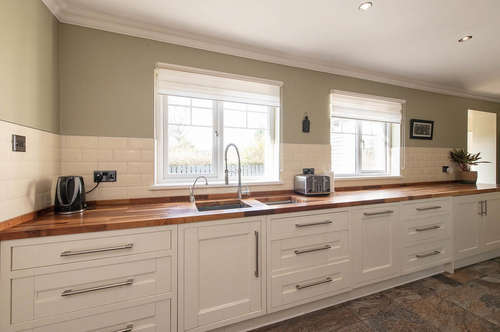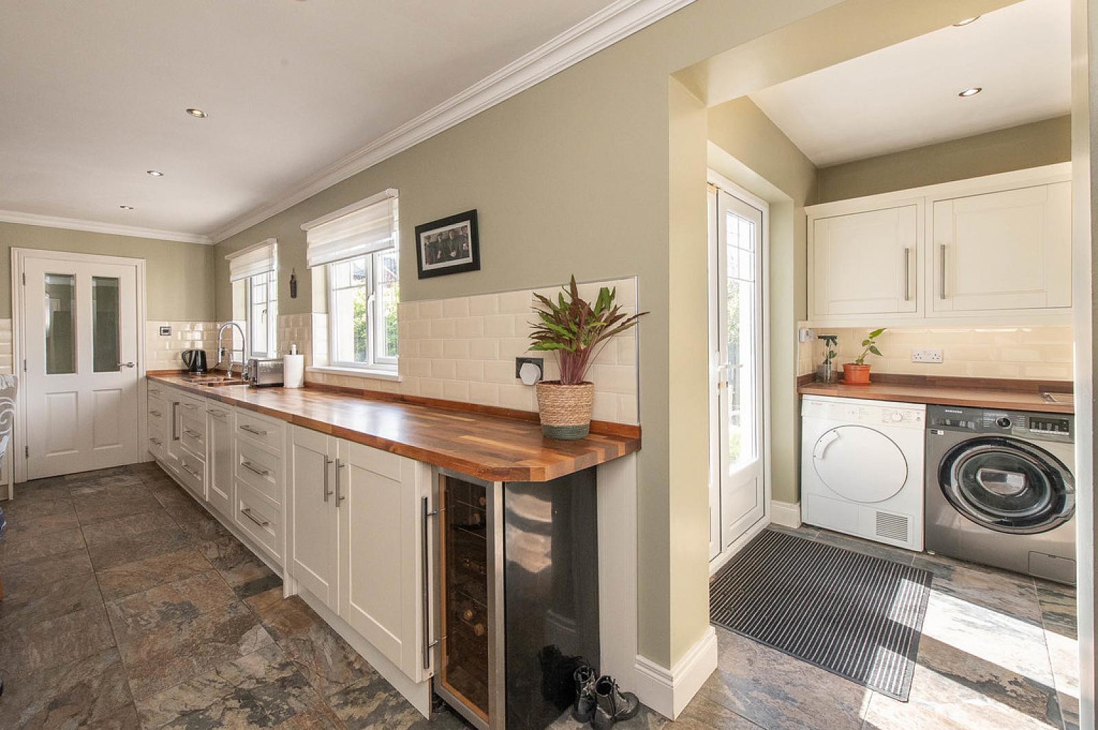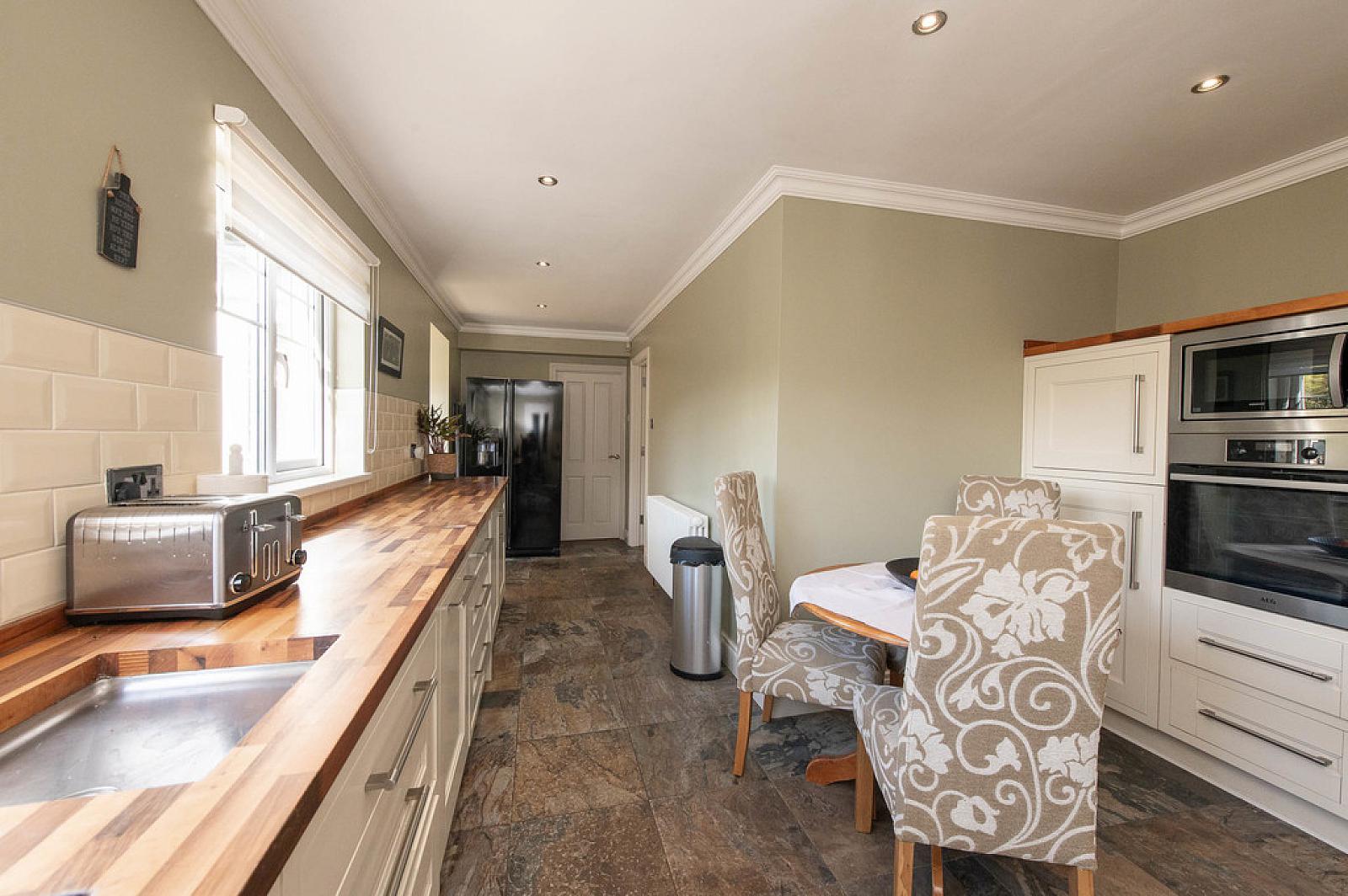 Fitted kitchen with built in appliances plus casual dining area