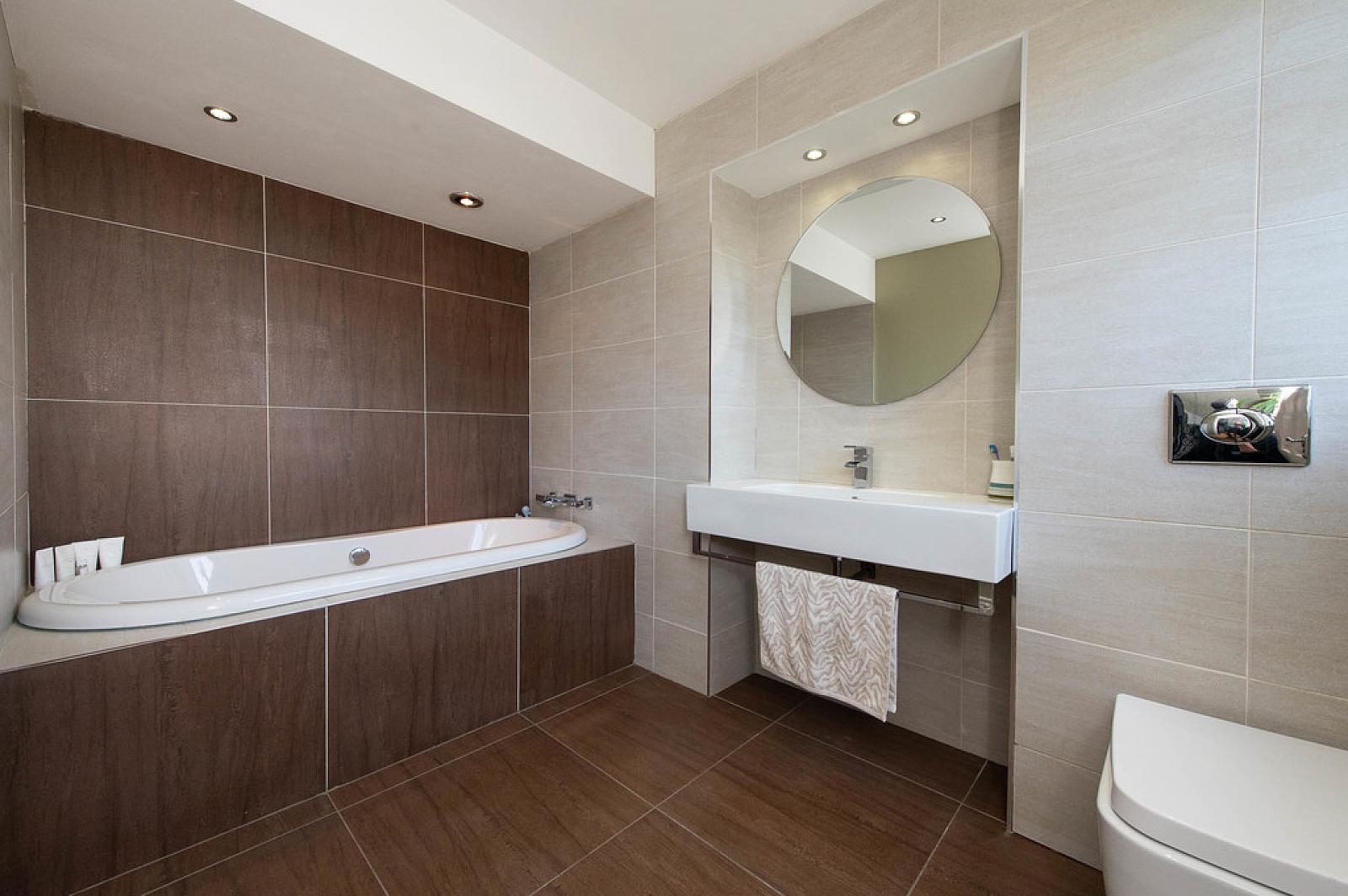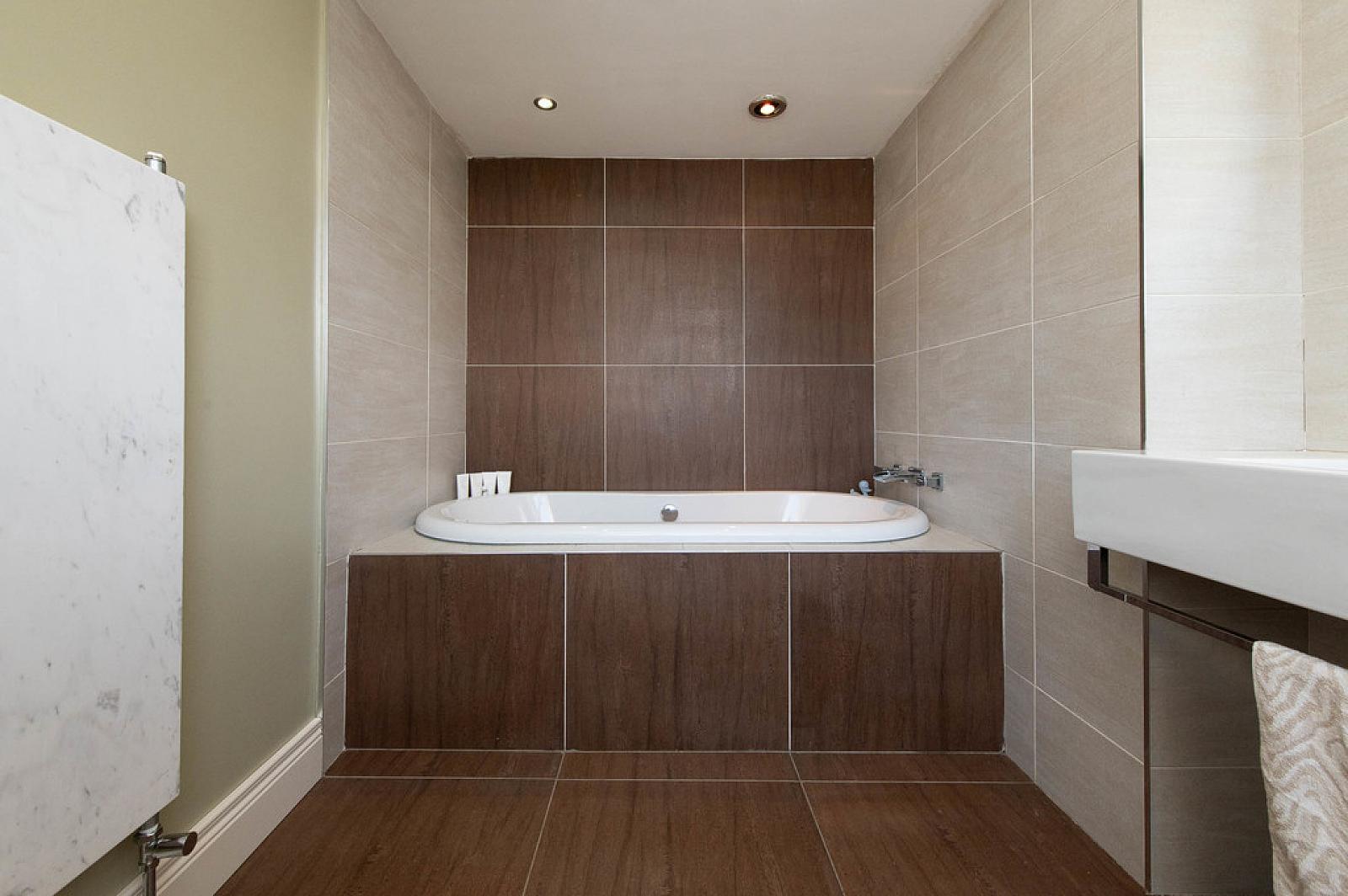 BATHROOM White suite. Built in roll top bath with mixer tap. Wash hand basin. Low flush WC. Modern towel rail. Downlighters. Tiling. Ceramic tiled floor.