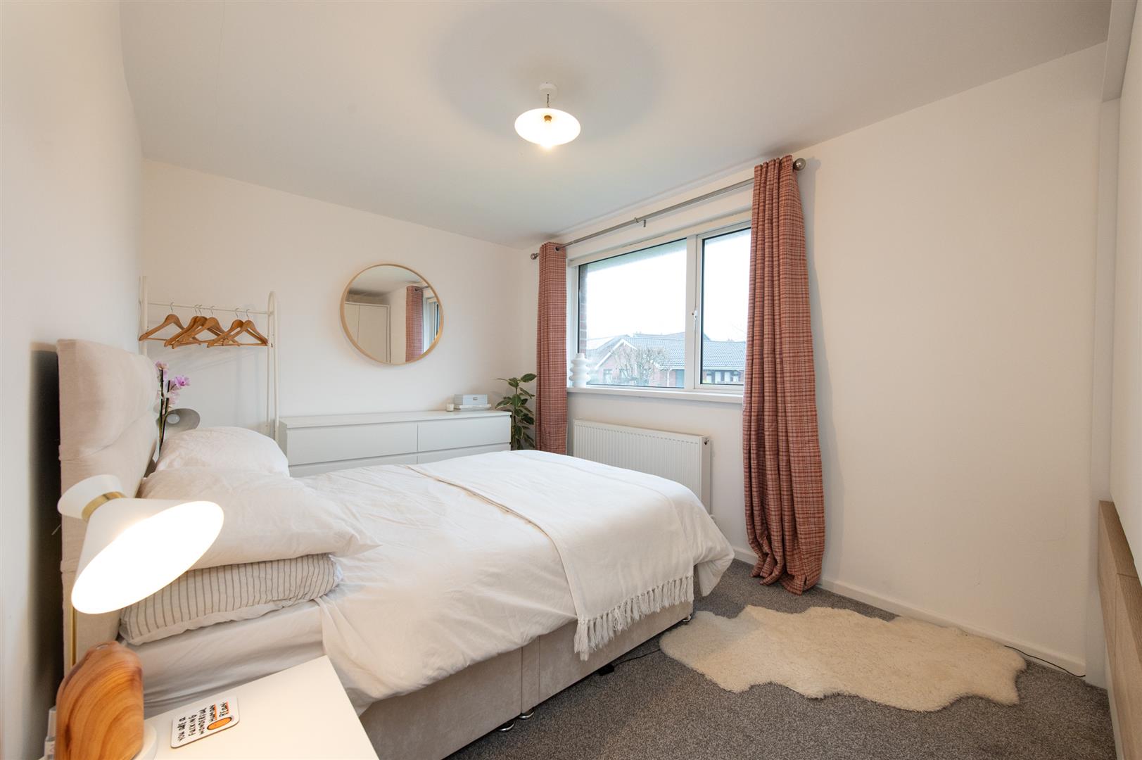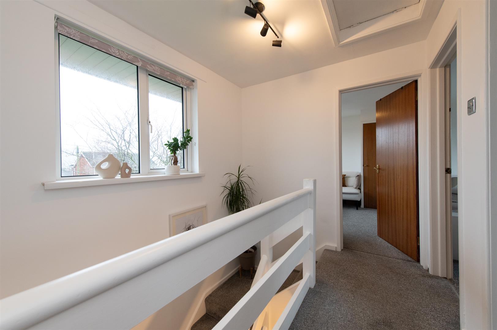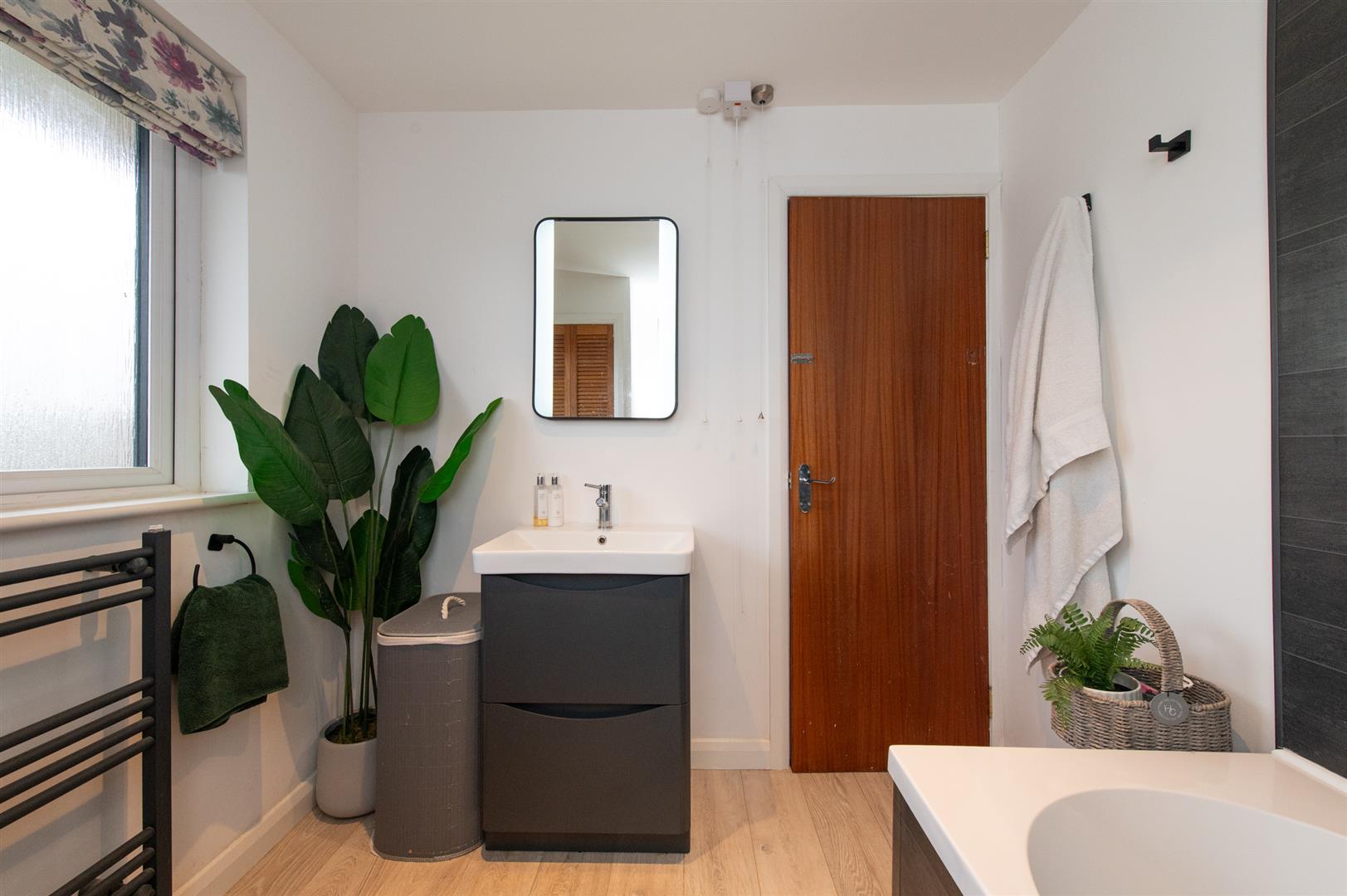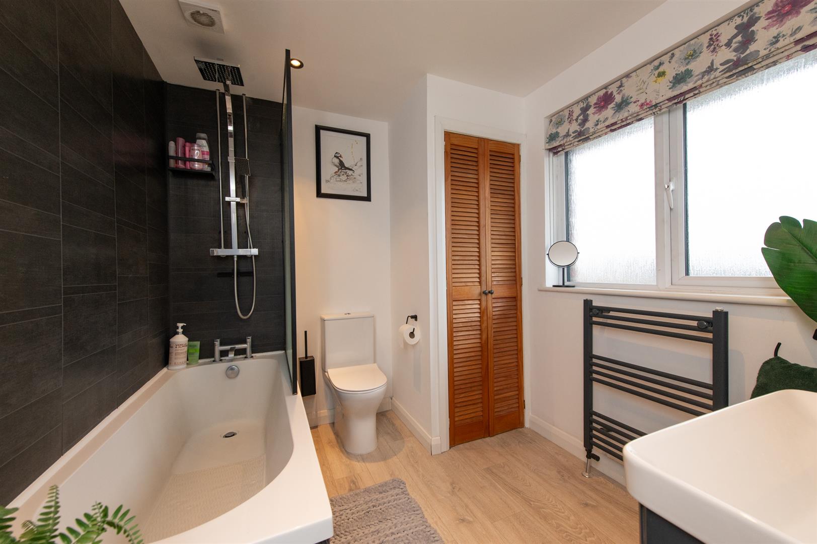 White suite, panelled bath with mixer tap and electric shower, low flush WC, vanity unit, heated towel rail, downlighters, linen cupboard with gas fired boiler