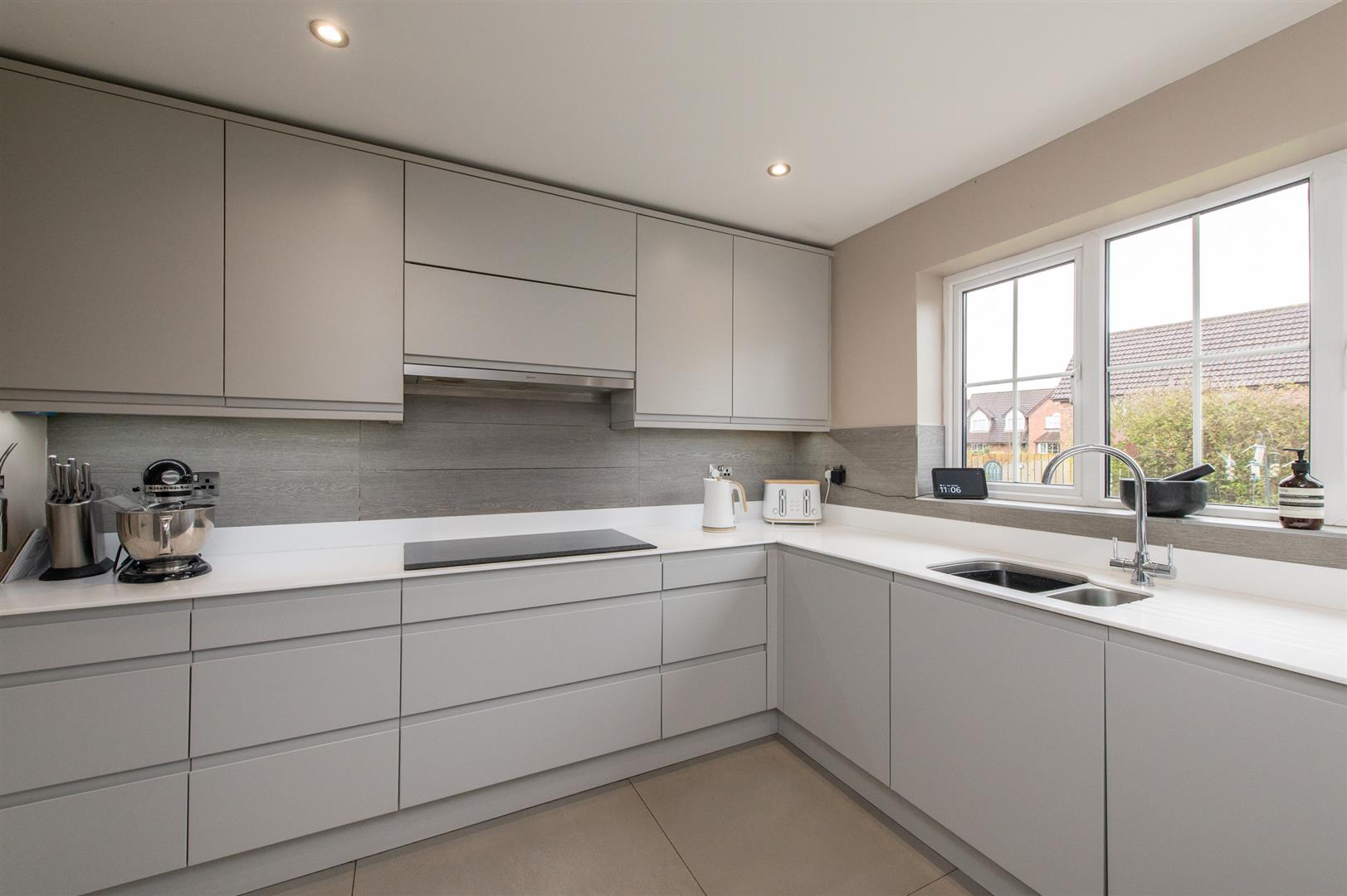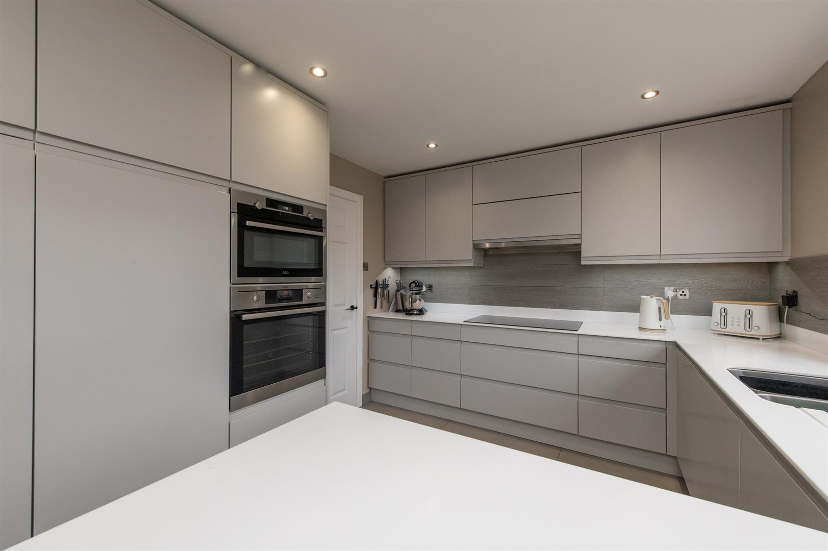 Range of high and low level unit, Corina worksurfaces with upstands incorporating stainless steel sink unit with mixer tap and Corina drainer, built in dishwasher, built in fridge, built in Aeg oven with microwave, built in Aeg fan assisted oven, built in induction hob, extractor fan, luxury floor tiling.