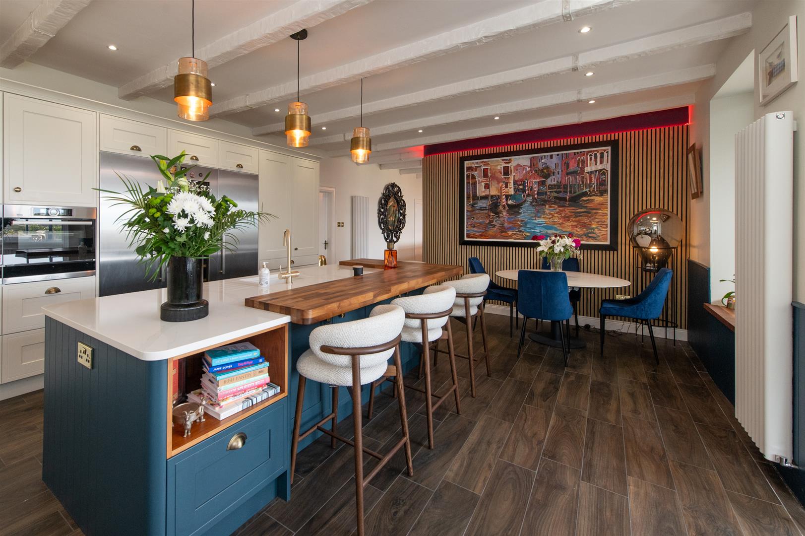 Range of high and low level units, marble work surfaces, built in twin Smeg and Bosch ovens, extractor fan, twin fridges, wine rack, island unit incorporating single drainer mixer tap, dishwasher, beam ceiling, downlighters, ceramic tiled flooring, display units, butler's pantry, casual dining area.