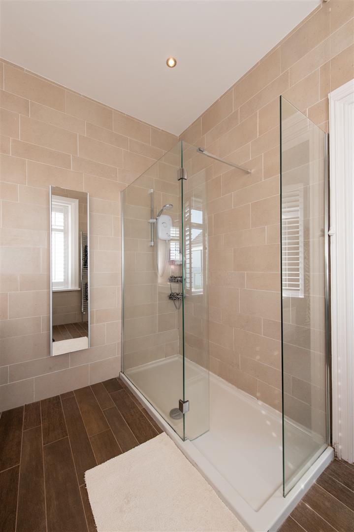 Low flush W/C, vanity unit with twin sinks, shower unit with electric shower, ceramic tiled flooring, downlighters, heated towel rail