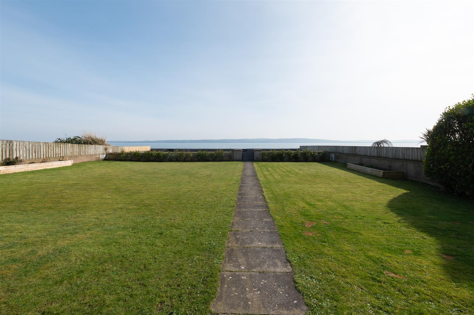 Front in lawn, plants, trees and shrubs, greenhouse, access to beach