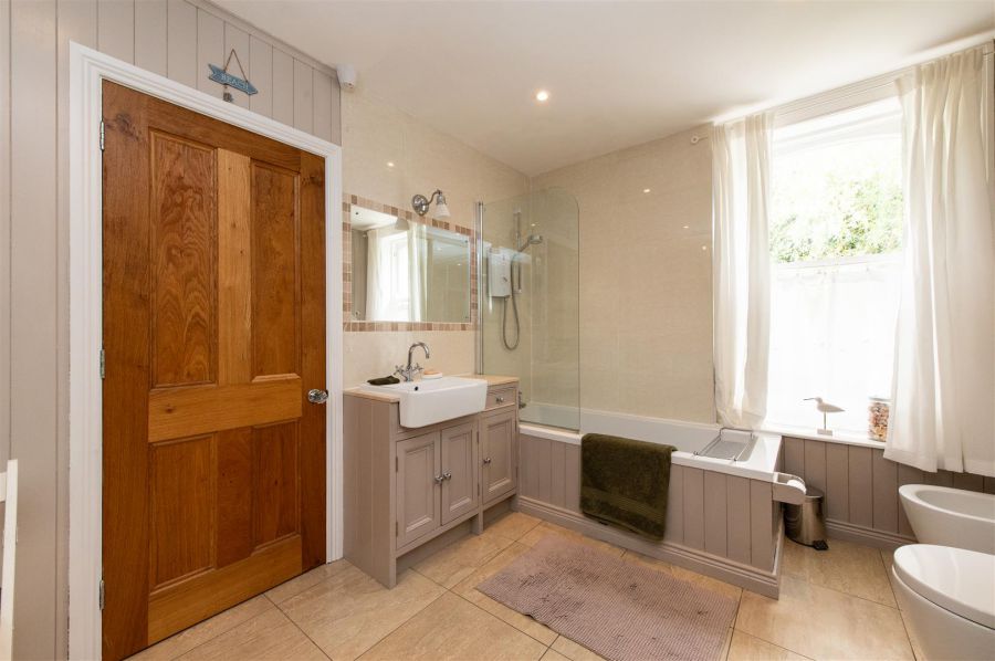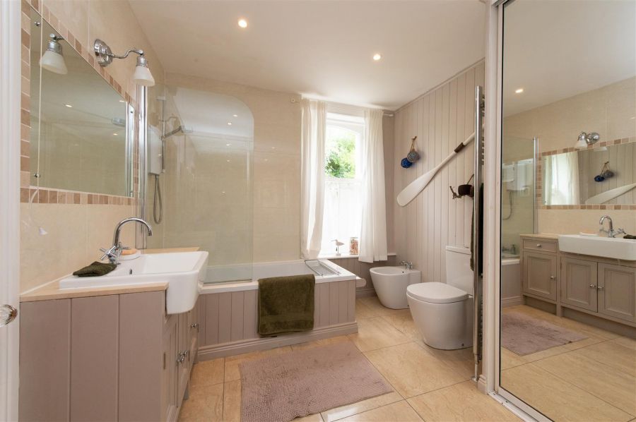 Modern vanity unit with mixer tap, panelled bath with mixer tap, glazed shower screen, electric shower, ceramic tiled flooring, low flush W/C, bidet, tiling, modern radiator, panelling, built in slide robes