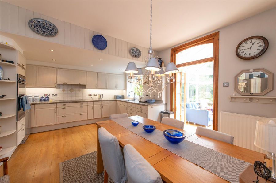 Range of high and low level units, granite worksurfaces, incorporating single drainer stainless steel sink unit with mixer tap and vegetable sink, inlaid hob unit, extractor fan, plumbed for dishwasher, double oven, display units, cornicing, laminate wood flooring, casual dining area, tiling and panelling, double doors to: