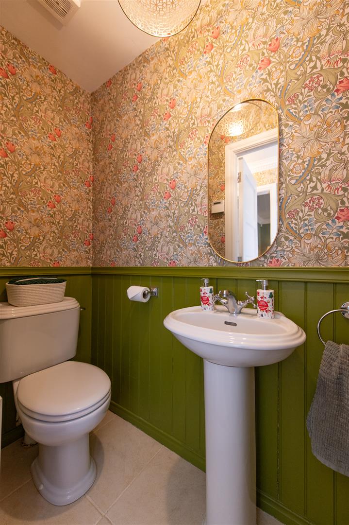 Low flush WC, pedestal wash hand basin, ceramic tiled flooring, panelling, extractor fan