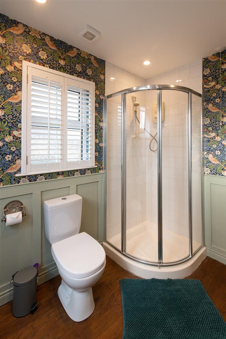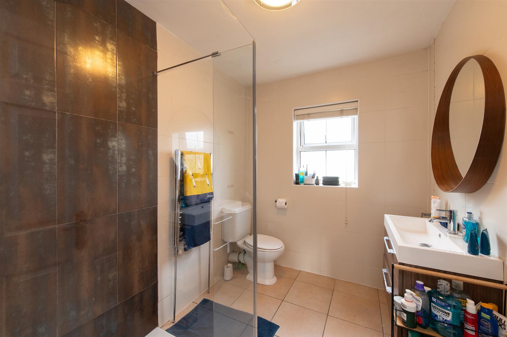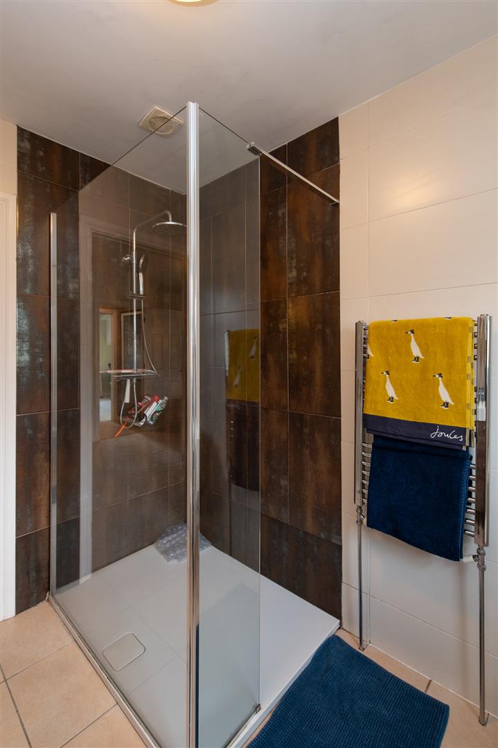 Low flush WC, vanity unit sink with mixer taps, controlled shower and overhead rain shower, ceramic tiled flooring, fully tiled walls, modern radiator, extractor fan