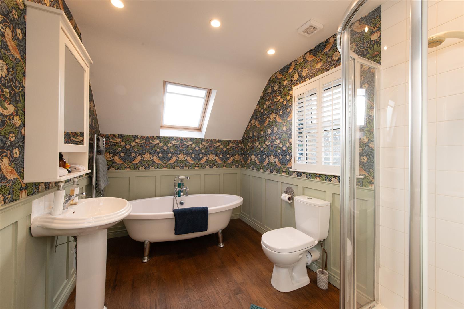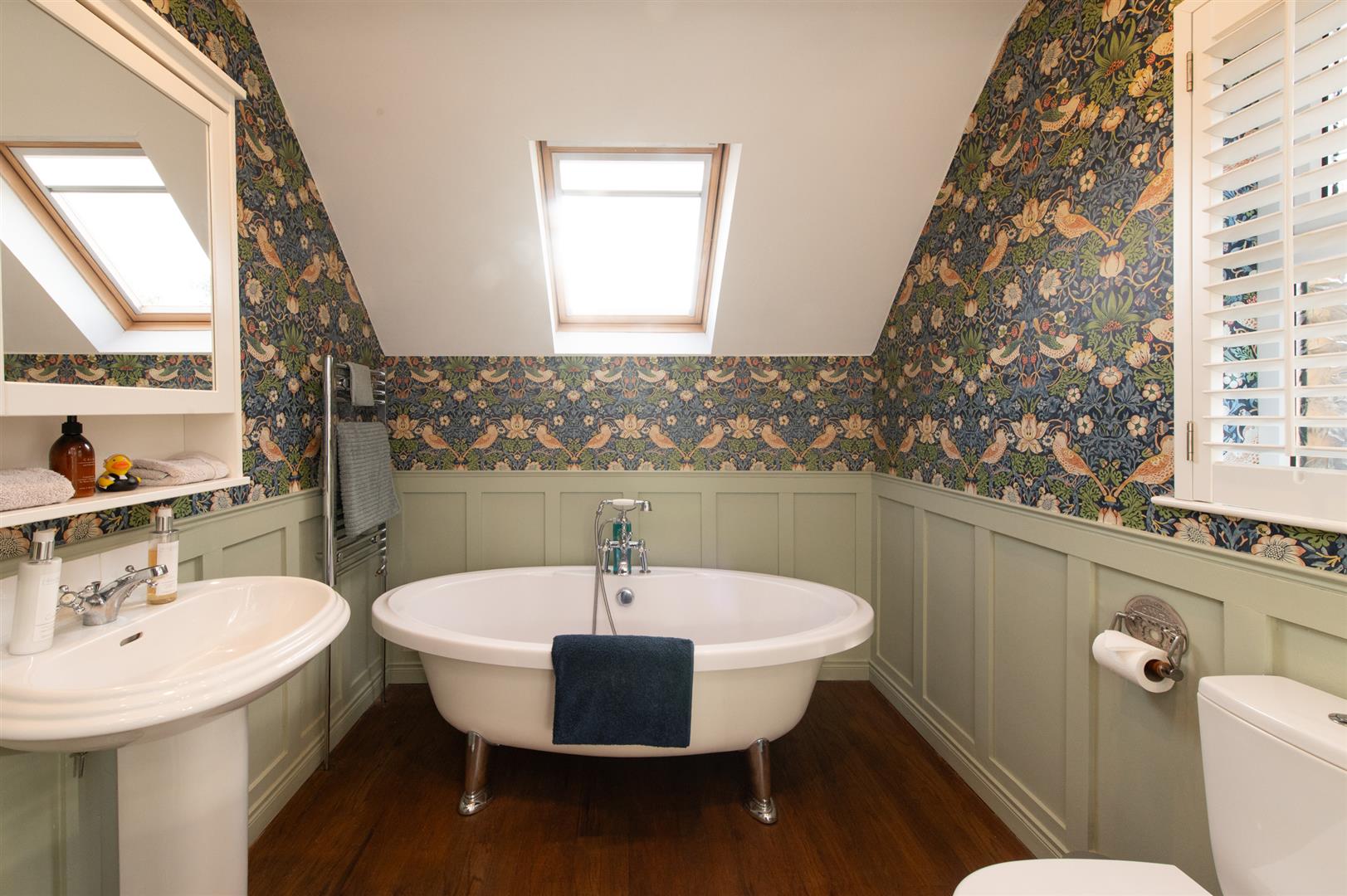 Modern white suite with roll top bath and mixer taps, telephone hand shower, low flush WC, separate electric shower, polished wood flooring, Velux window, downlighters, extractor fan, panelling