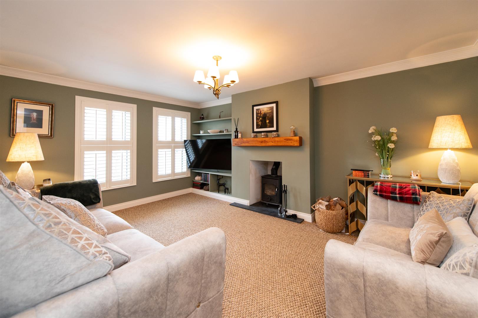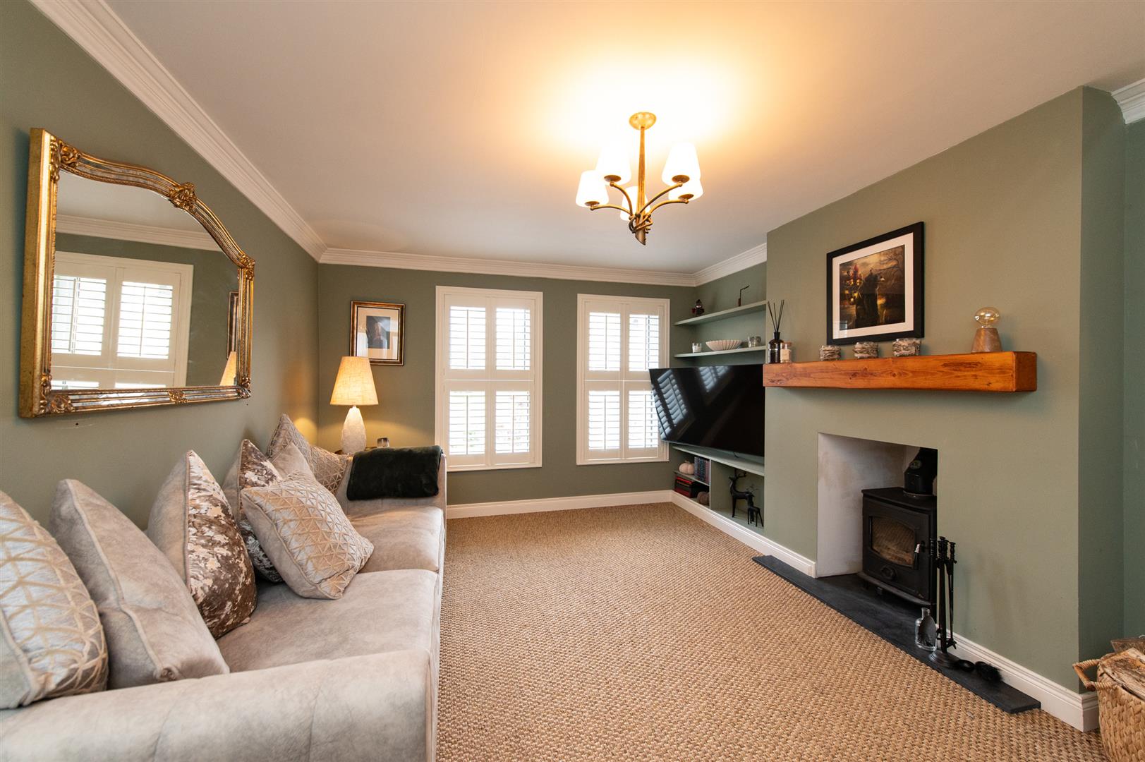 Mantle and slate hearth, wood burning fire, cornicing, window shutters