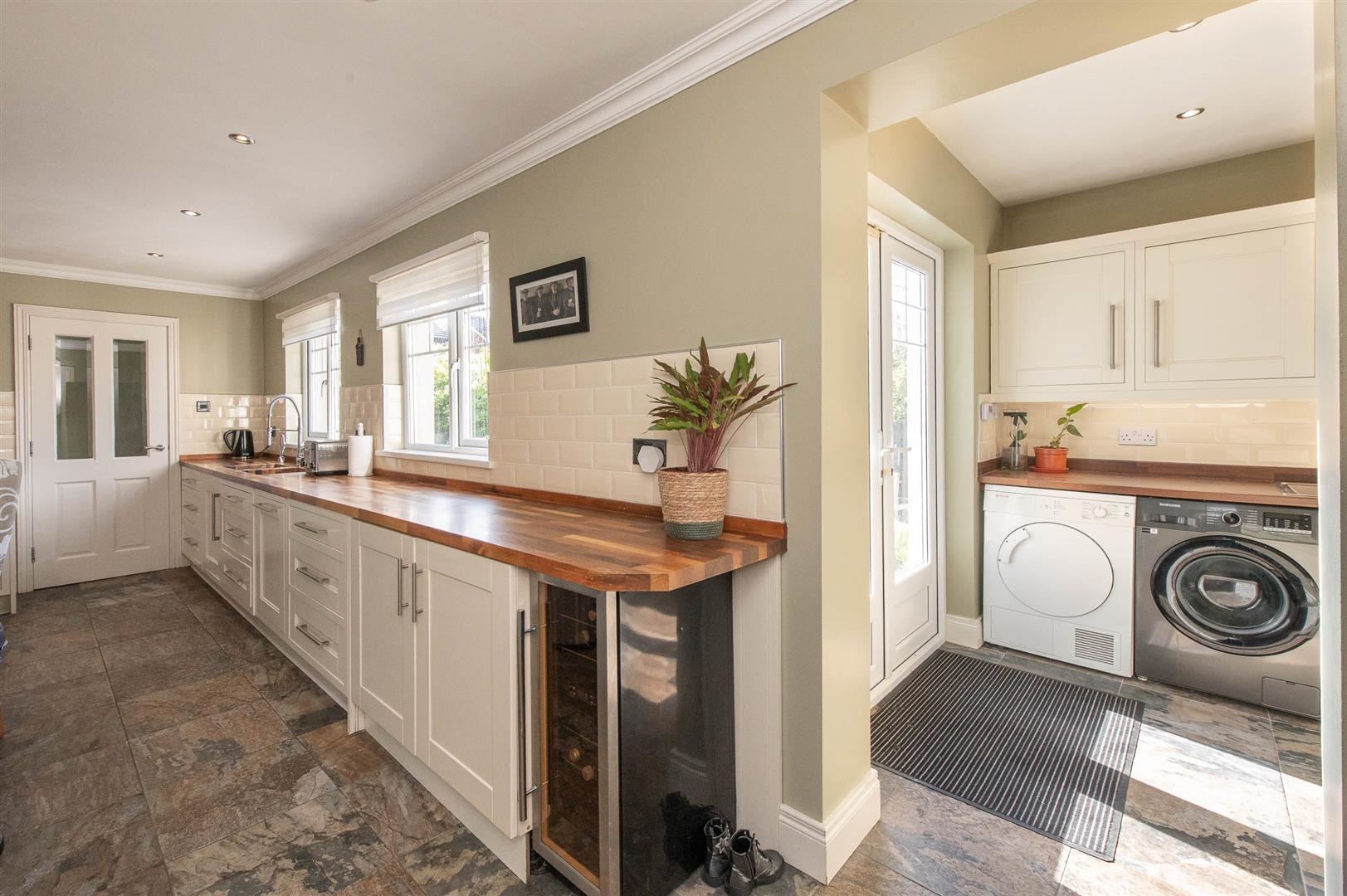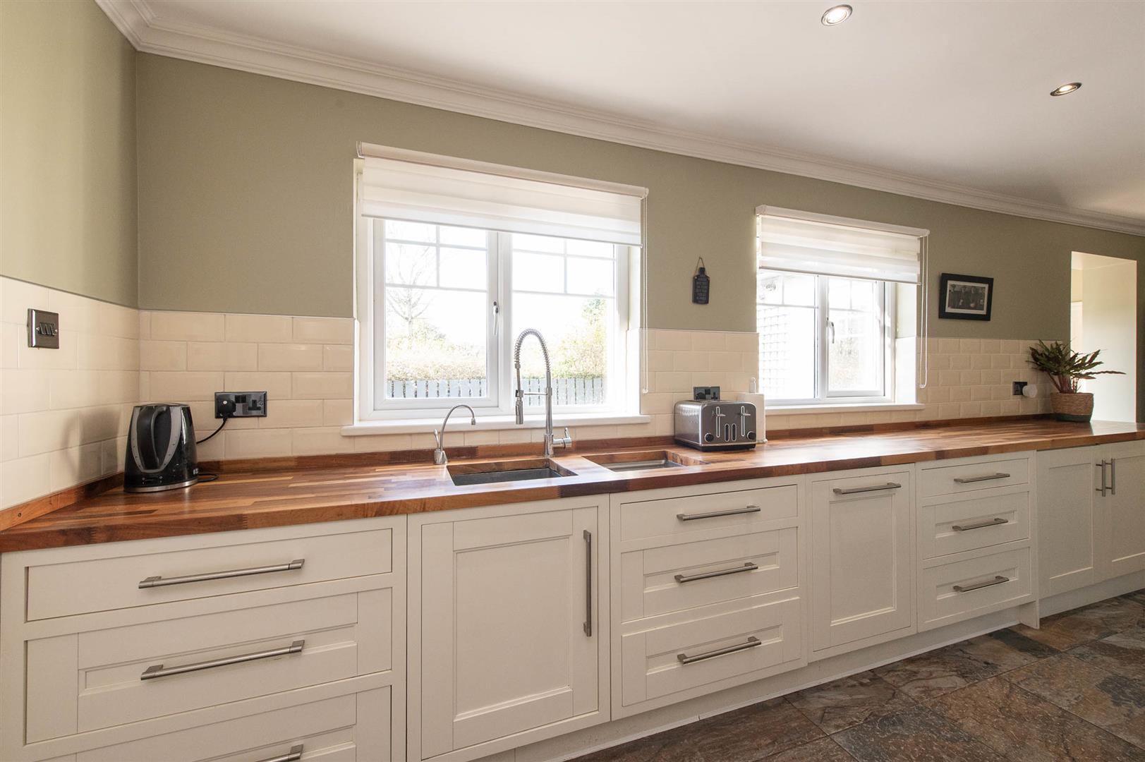 Built in high and low level units. Single drain stainless steel sink unit with mixer tap. Round edge work surfaces. Panelling. Downlighters. Wall tiling. Floor tiling. Cornicing. French doors.
