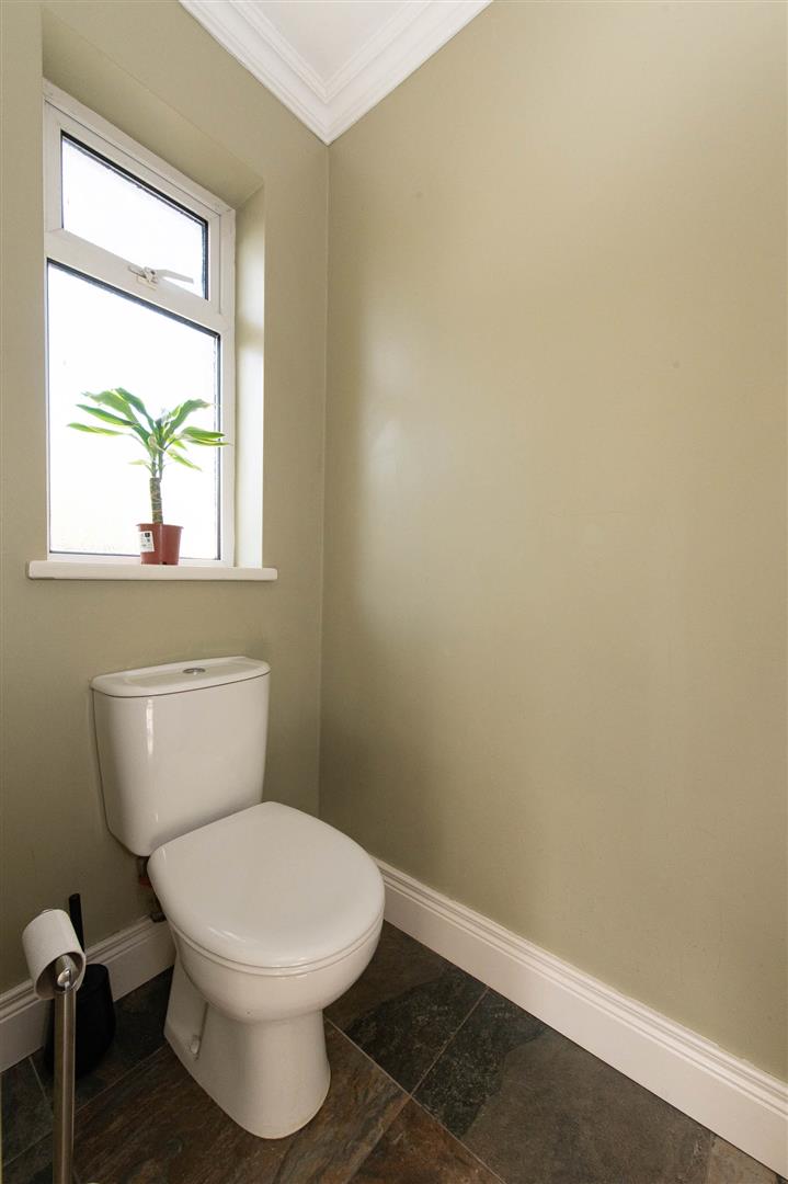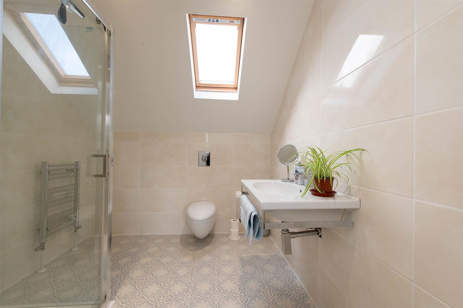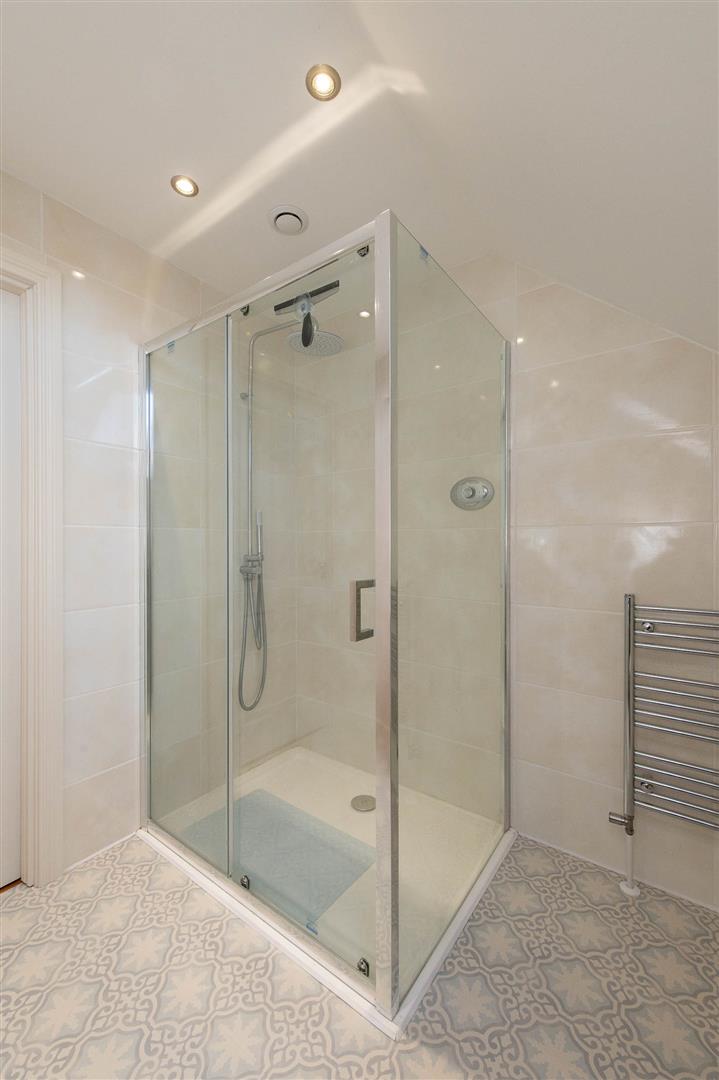 Controlled shower. Wall hung wash hand basin. Low flush WC. Modern towel radiator. Extractor fan.