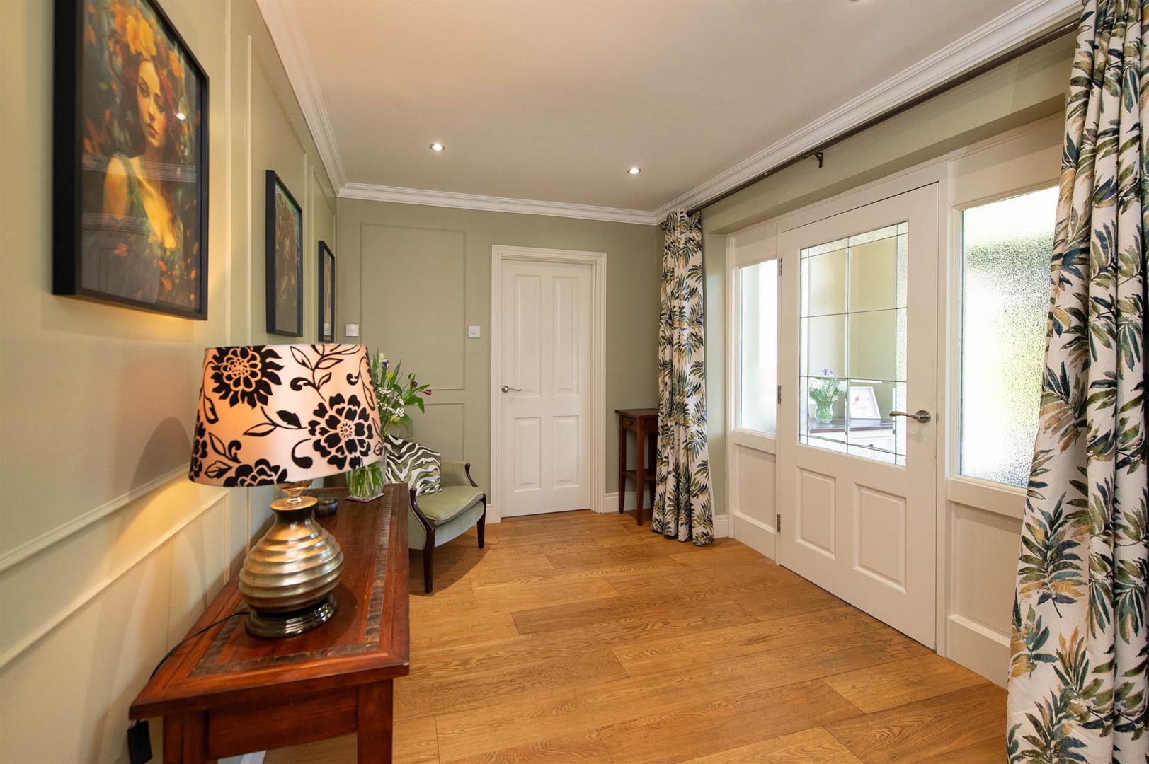Polished wood floor. Feature panelling. Downlighters. Cornicing. Glazed double doors to: