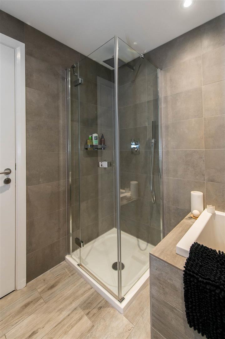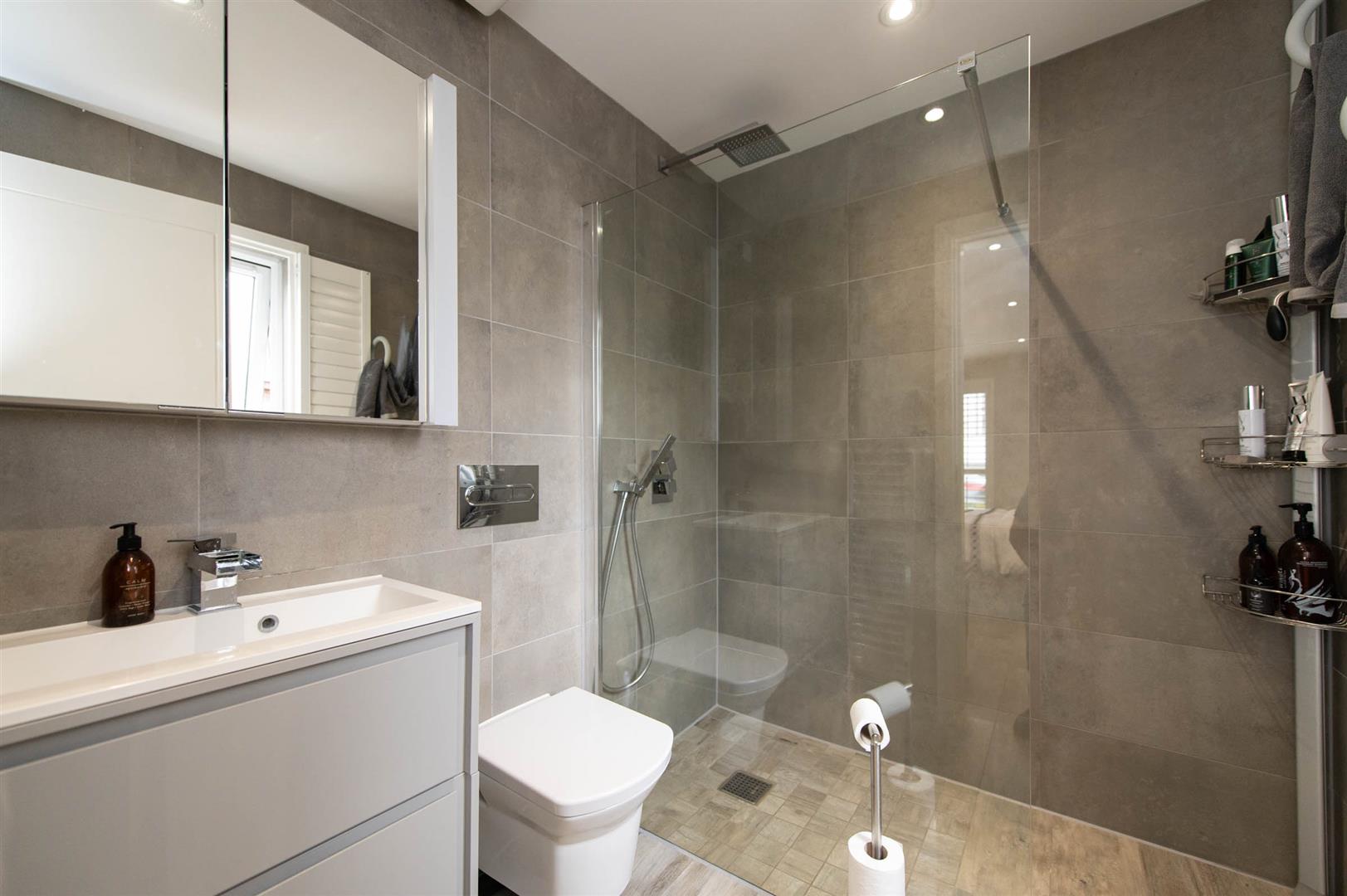 Glazed shower screen, controlled shower, overhead rain shower, wall tiling, vanity unit, modern radiator/ towel rail, extractor fan