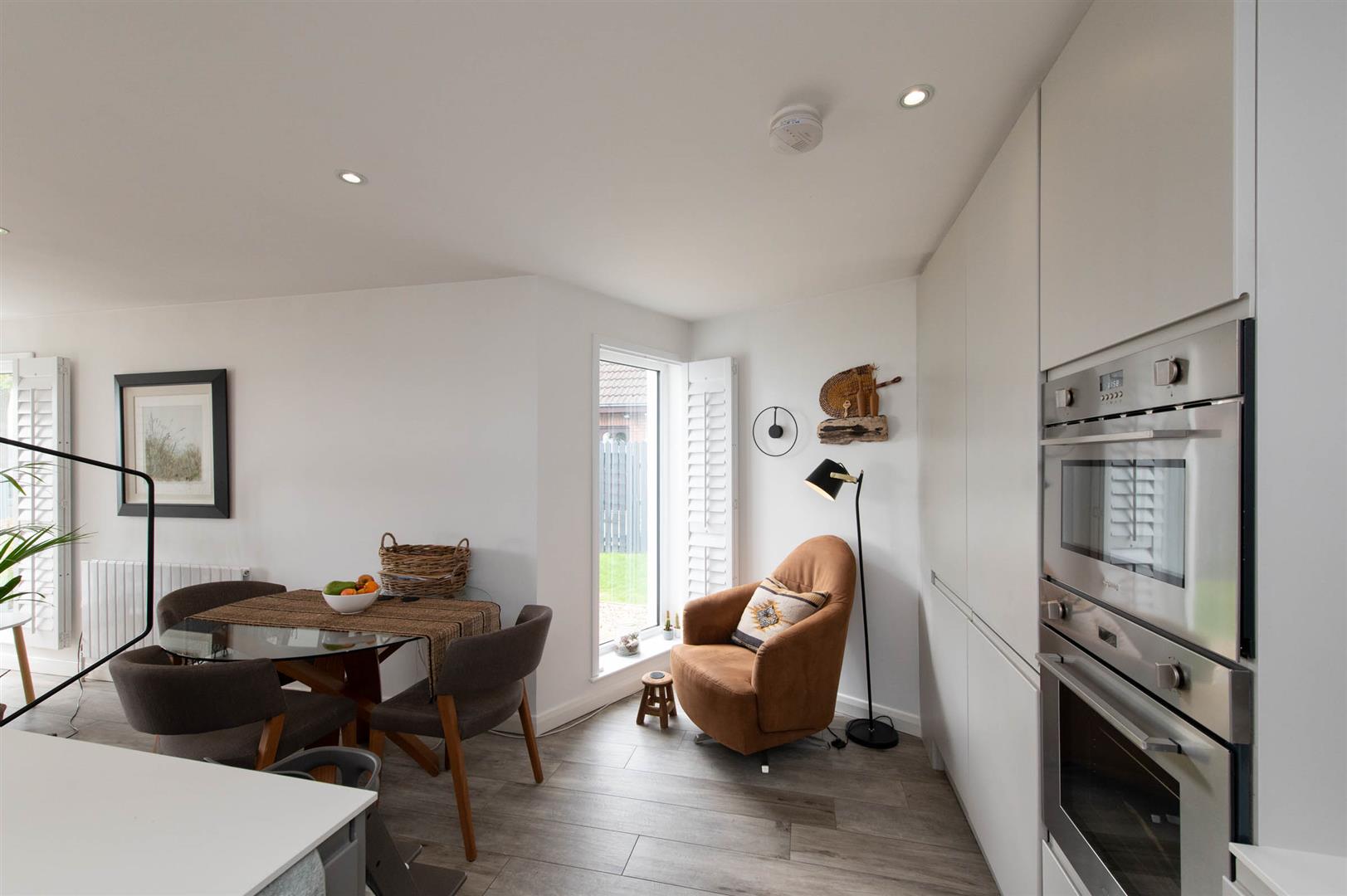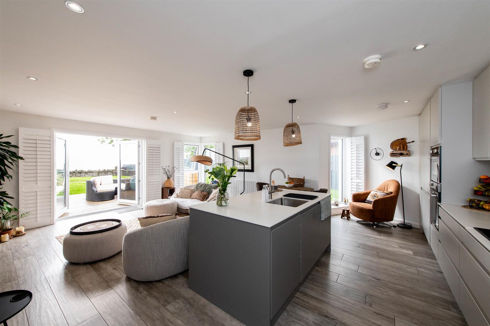 Range of high and low level units, luxury worksurfaces, inlaid hob unit, dishwasher, double oven and microwave, extractor fan, breakfast bar, ceramic tiled flooring, downlighters, French doors to decking