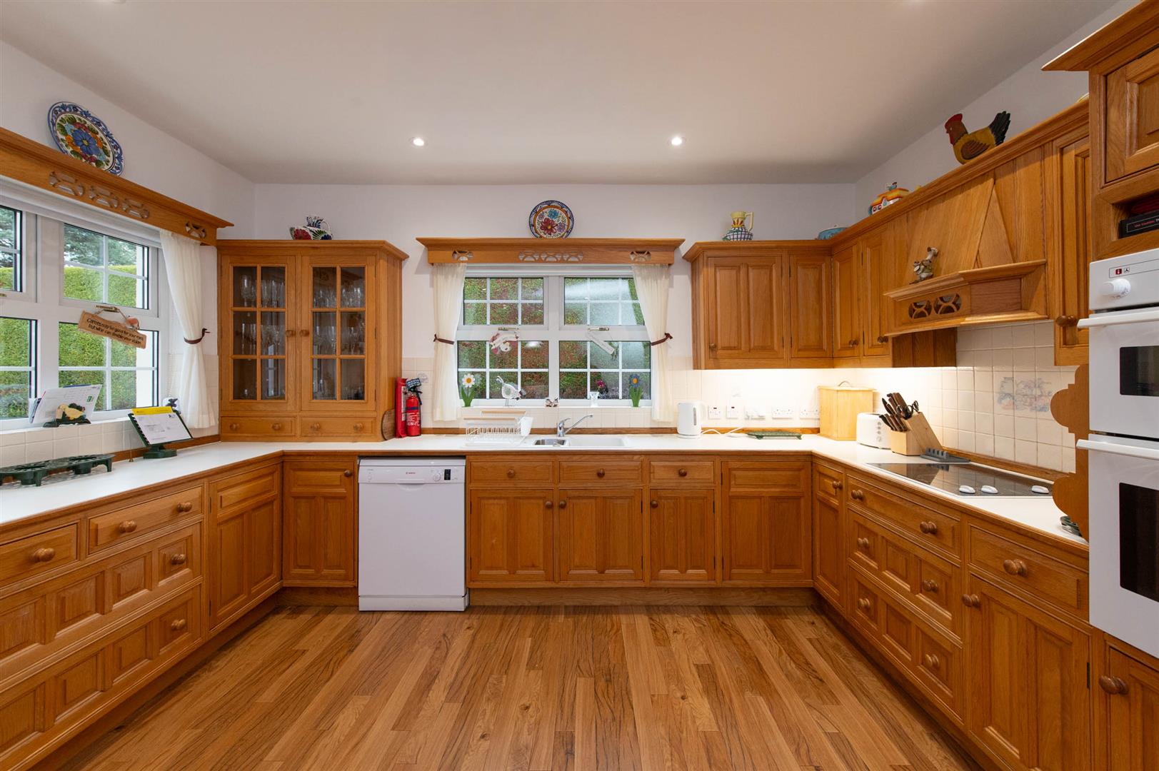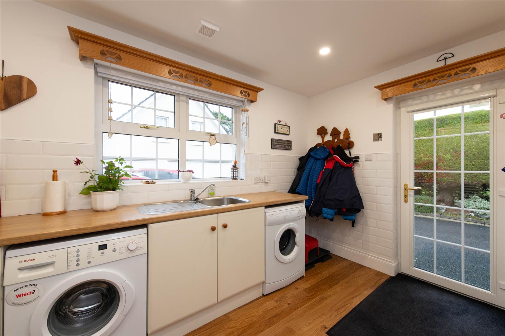 Range of units, round edge worksurfaces, stainless steel sink unit with mixer tap, plumbed for washing machine, Karndean flooring, doors to garden