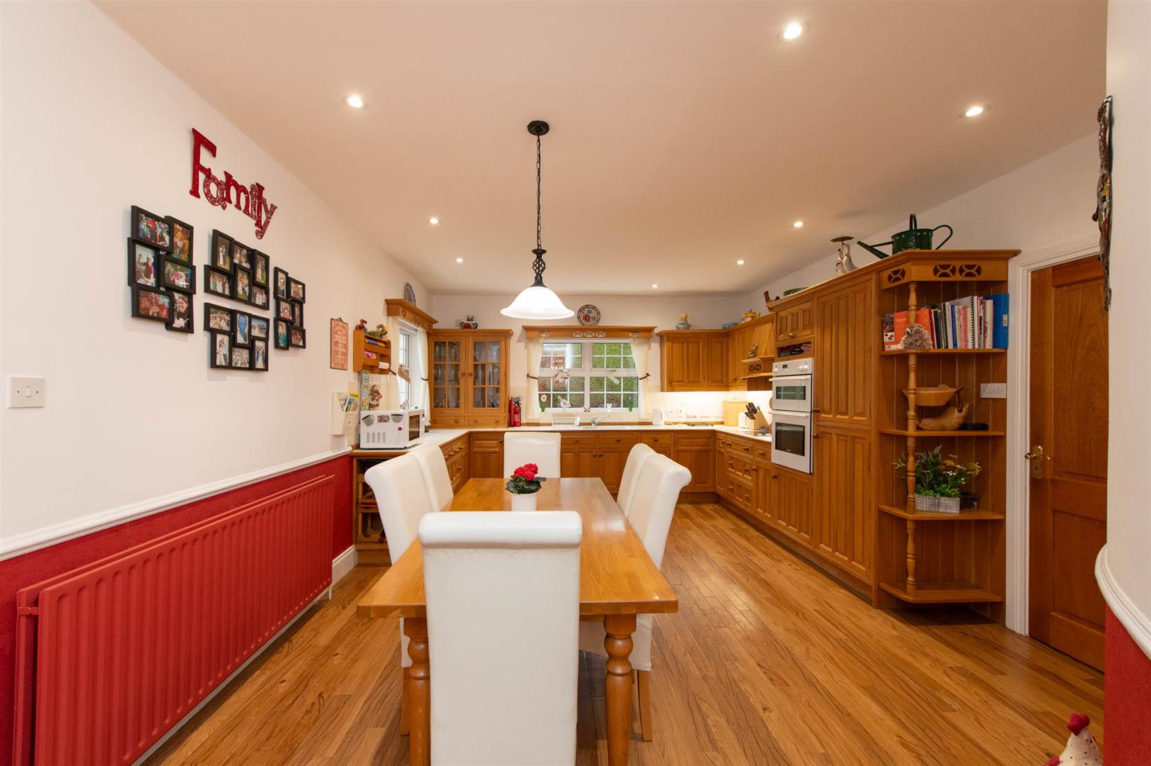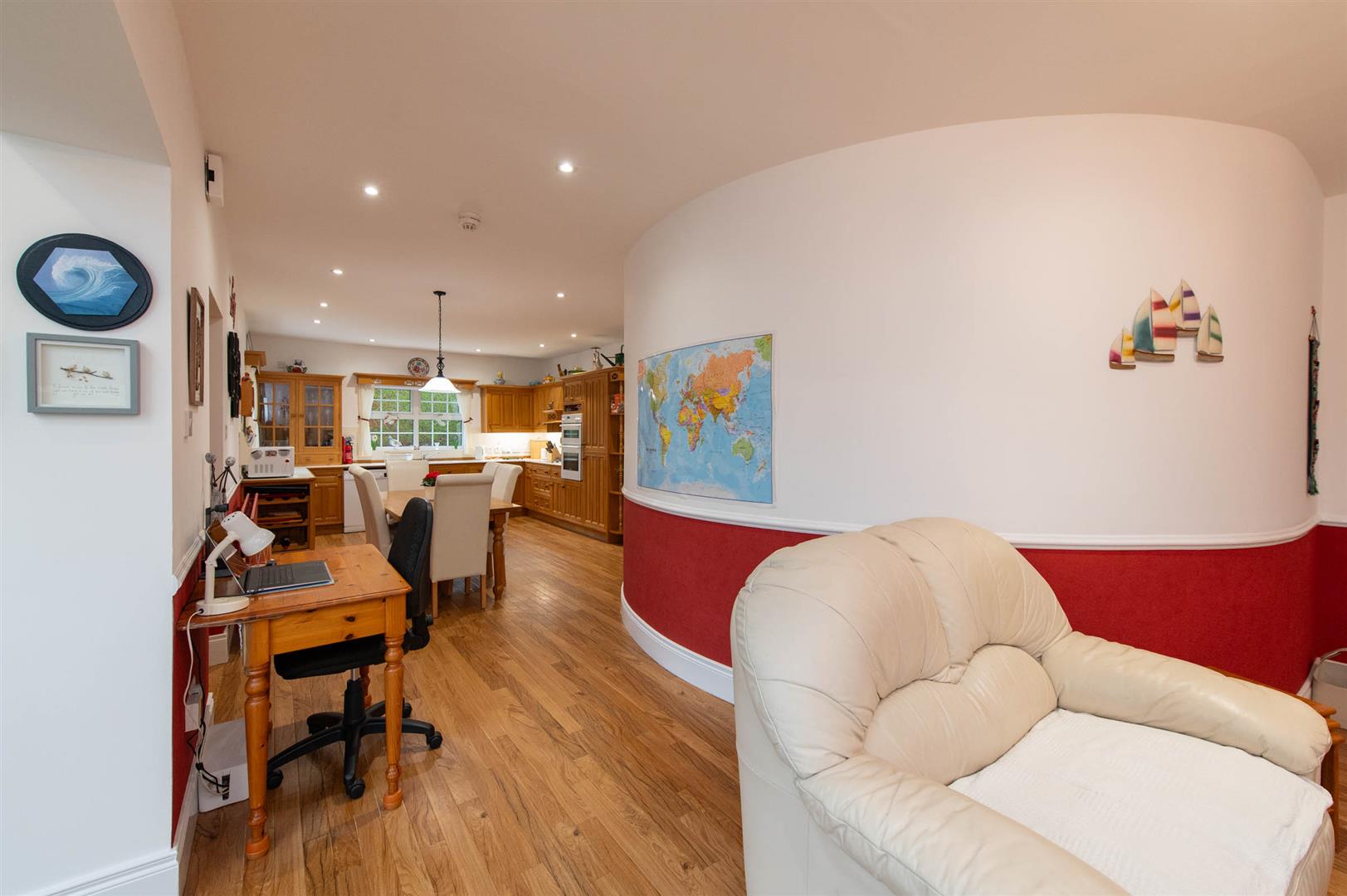 Feature curved wall, modern fitted kitchen with range of high and low level units, ceramic sink unit with mixer tap and vegetable sink, built in hot point hob, built in double Neff oven, canopy extractor fan, plumbed for dishwasher, built in fridge freezer, cornicing, tiling, karndean flooring.