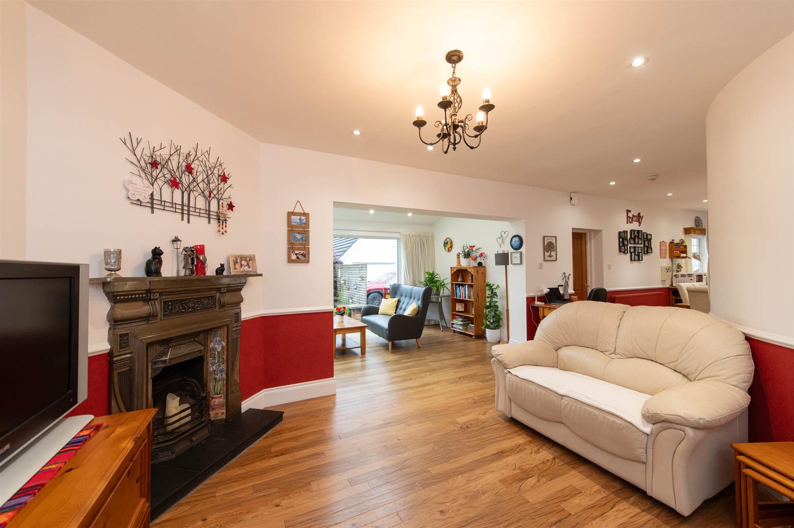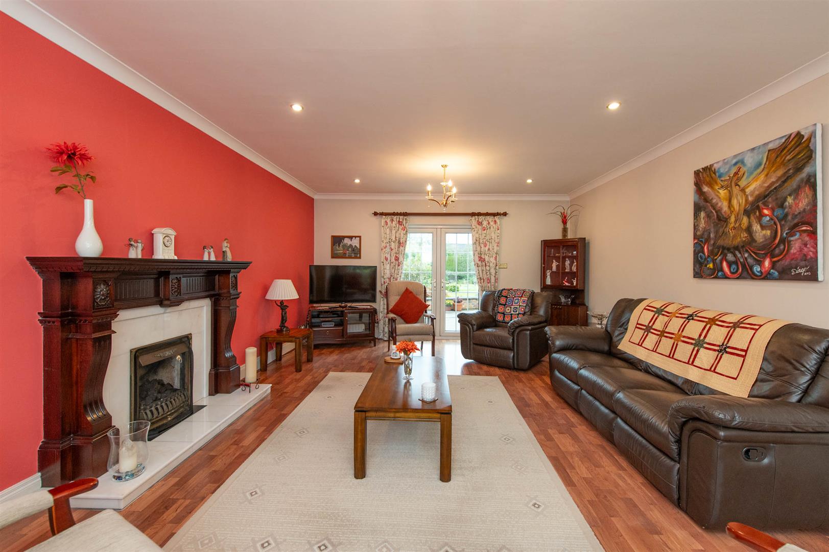Cornicing, laminate wood flooring, feature fireplace (piped for gas fire), French doors to rear, downlighters, dimmer switch