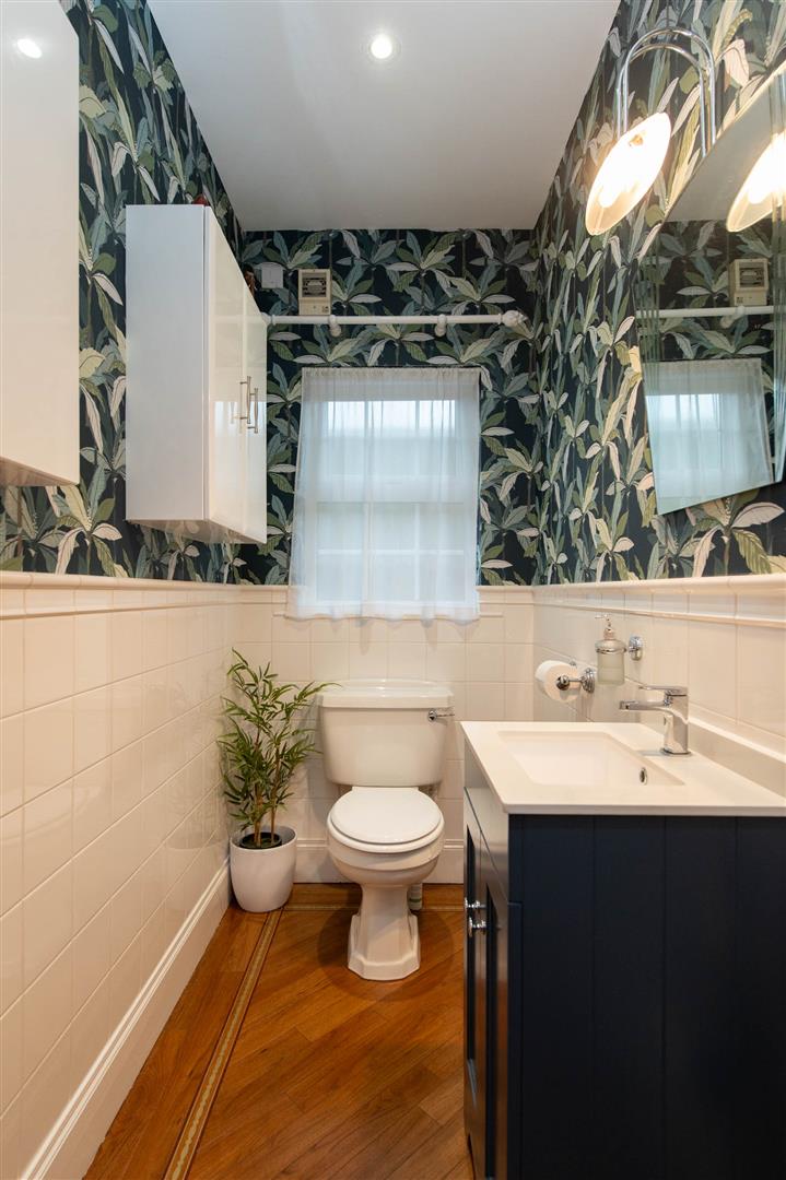 Low flush W/C, vanity unit with mixer tap, tiling, amtico flooring