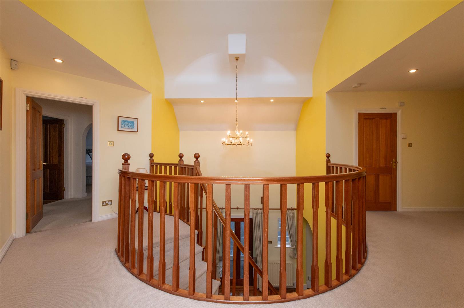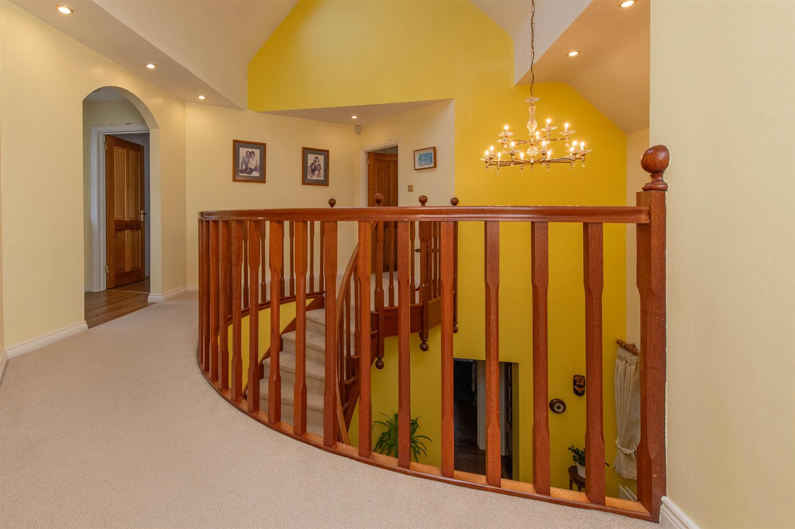 Curved feature banister with large balcony area and Velux roof window light, linen walk in hot press with cylinder and gas boiler, Karndean flooring