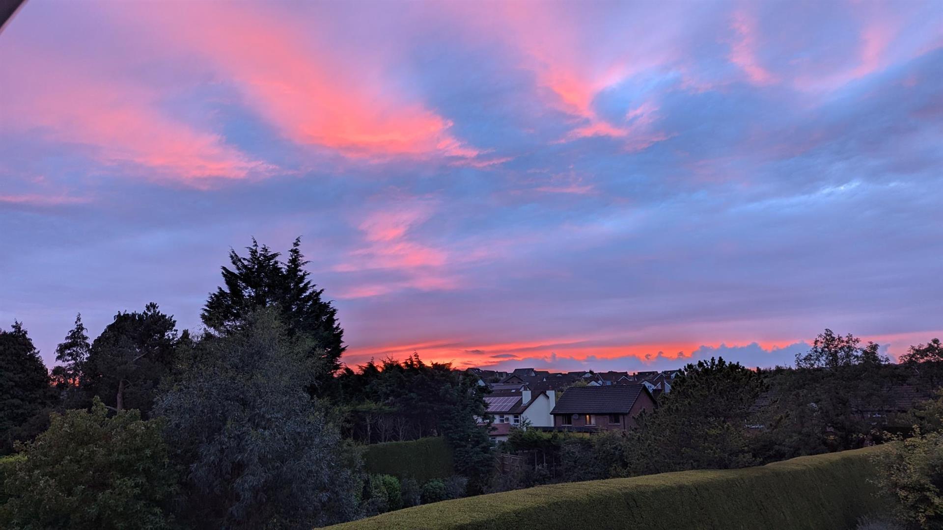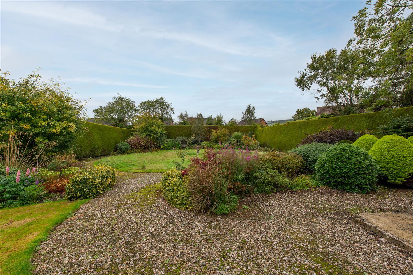 Rear in parking, paved patio area, generous lawn with mature plants, trees and shrubs, natural wildflower meadow area with plants, trees and shrubs, outside socket and lighting, water tap