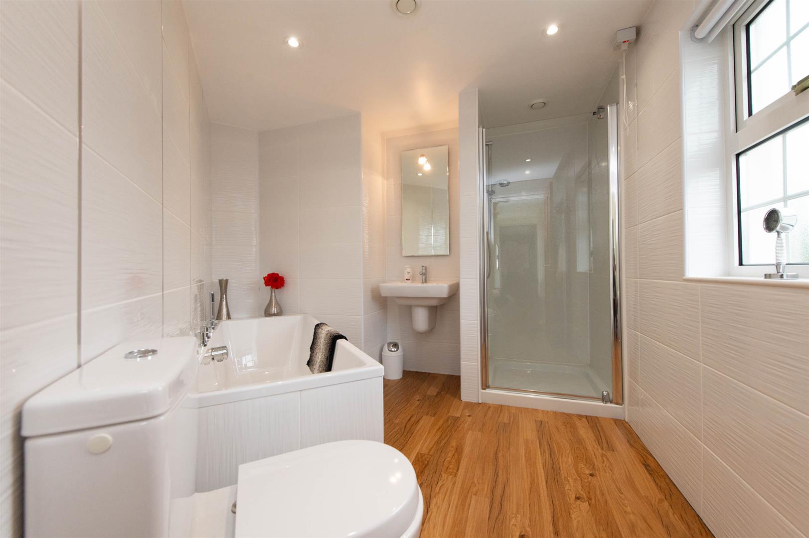 Low flush W/C, vanity unit with mixer tap, large shower unit with controlled shower, heated towel rail, karndean flooring