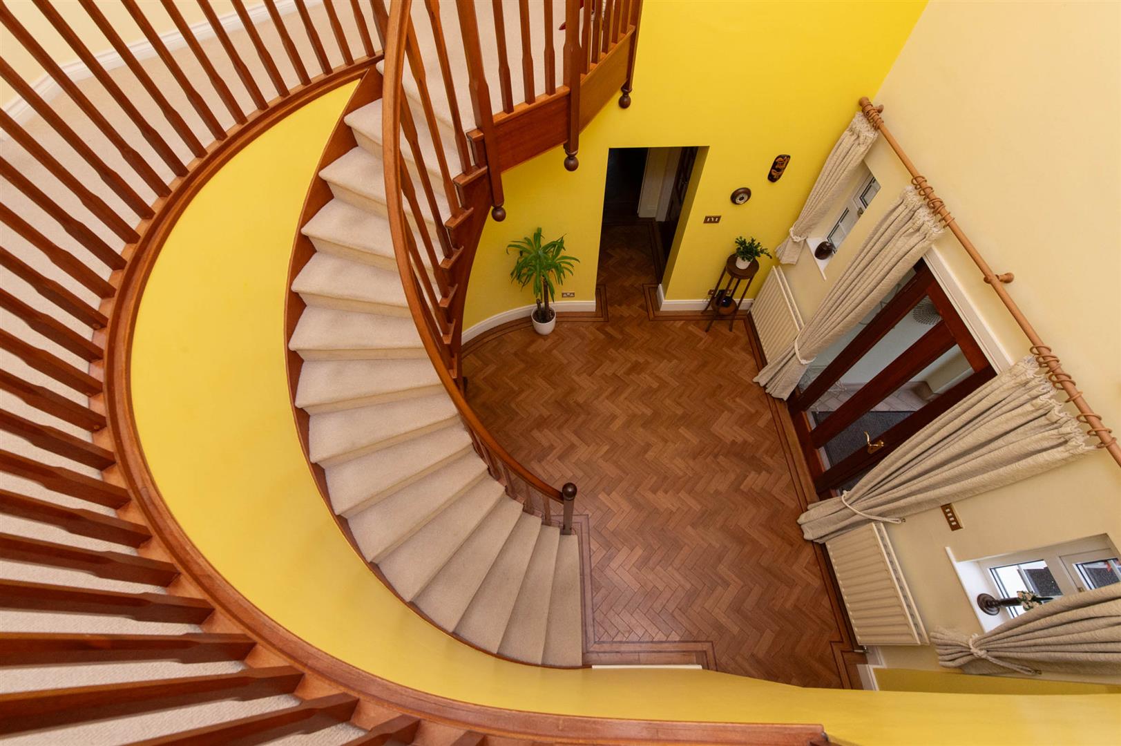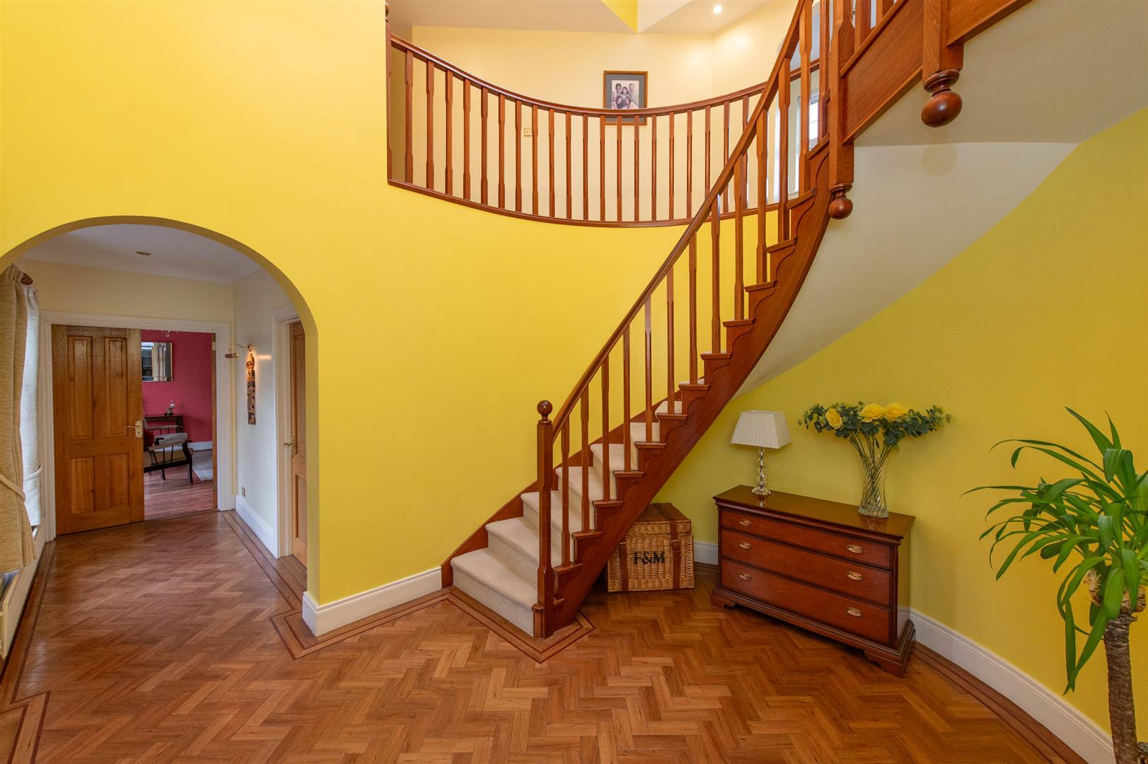 Amtico parquet flooring, elegant curved staircase, wired for wall lights