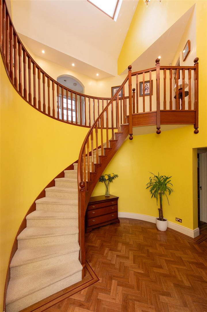 A magnificent detached residence, rarely available in this highly regarded part of Glenkeen Avenue, Jordanstown. Set within a large mature site, the property offers both privacy and generous outdoor space, making it a perfect family home. The accommodation is substantial, comprising four bedrooms, three of which benefit from en suite facilities, with the principal bedroom also enjoying its own dressing room. The ground floor is rich in character, featuring elegant curved walls, an impressive staircase and a gallery landing that enhances the sense of space and light. Externally, the extensive gardens are complemented by a triple garage and a versatile annex above, ideal for a home office, studio or guest accommodation. Combining distinctive architecture with practical family living, this is a rare opportunity to acquire a prestigious home in one of Jordanstown´s most sought-after locations.