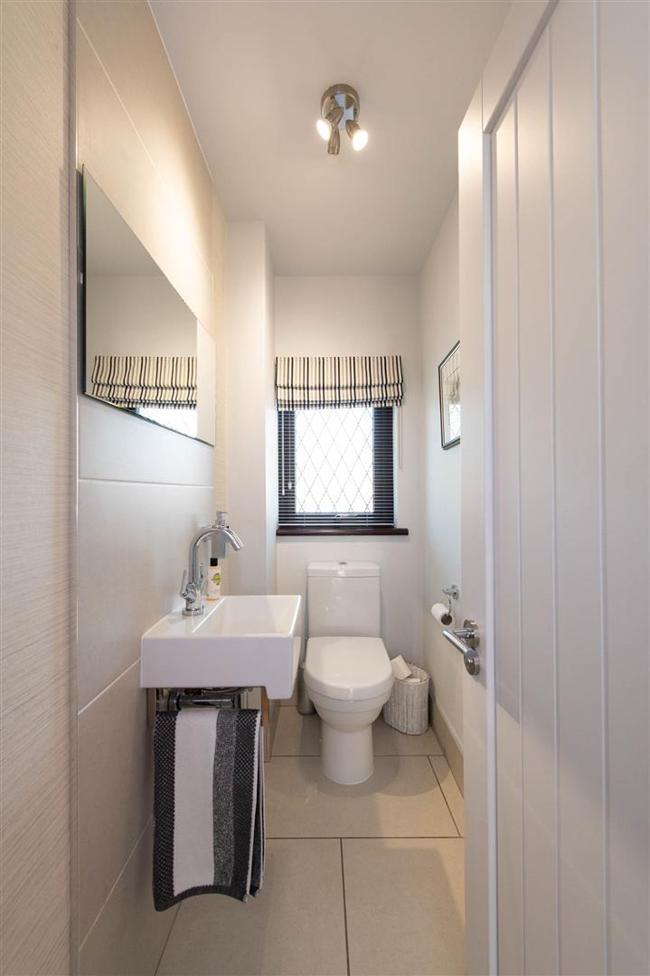 Low flush W/C, mirror, wall tiling, wash hand basin, ceramic tiled flooring