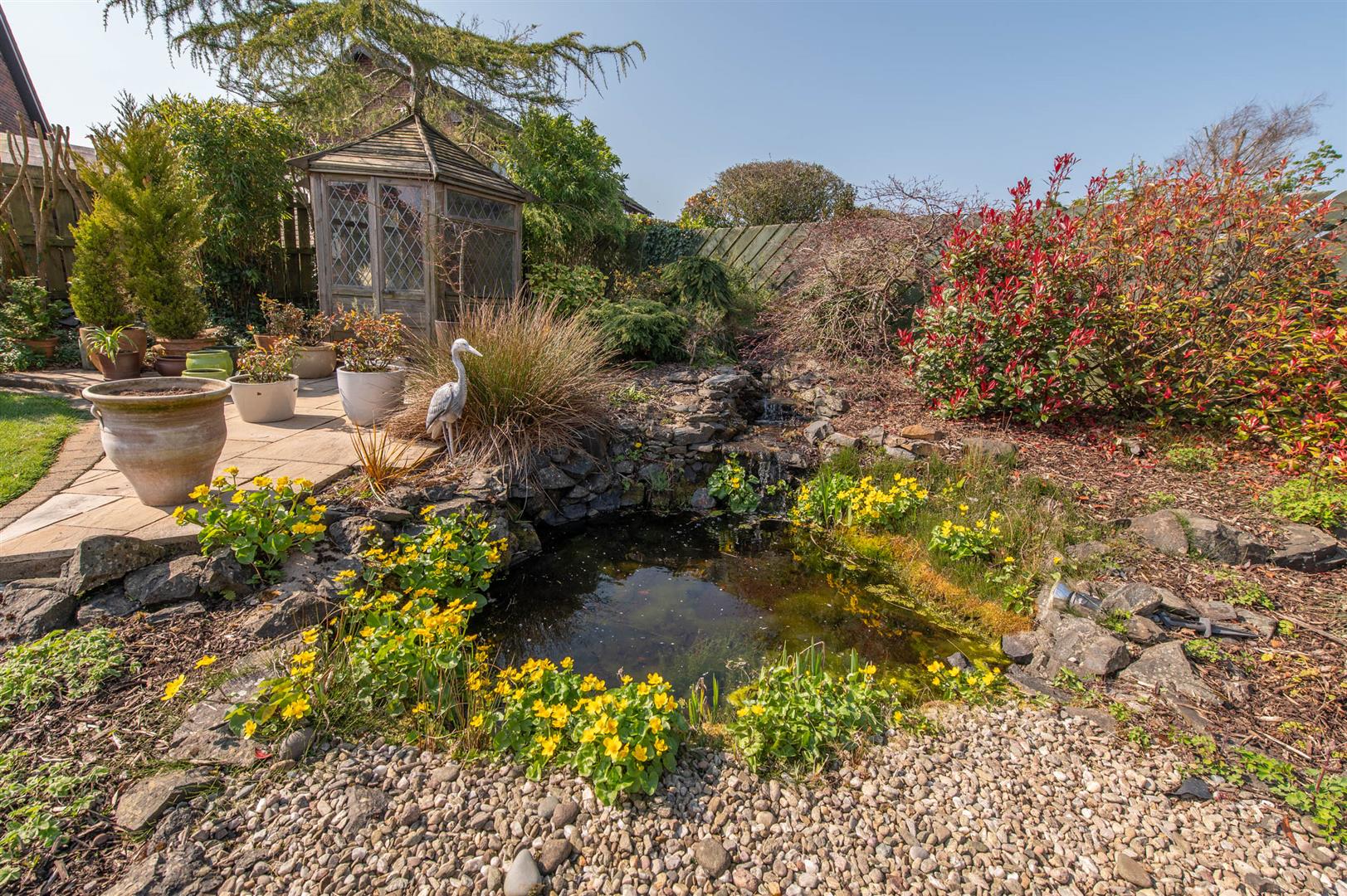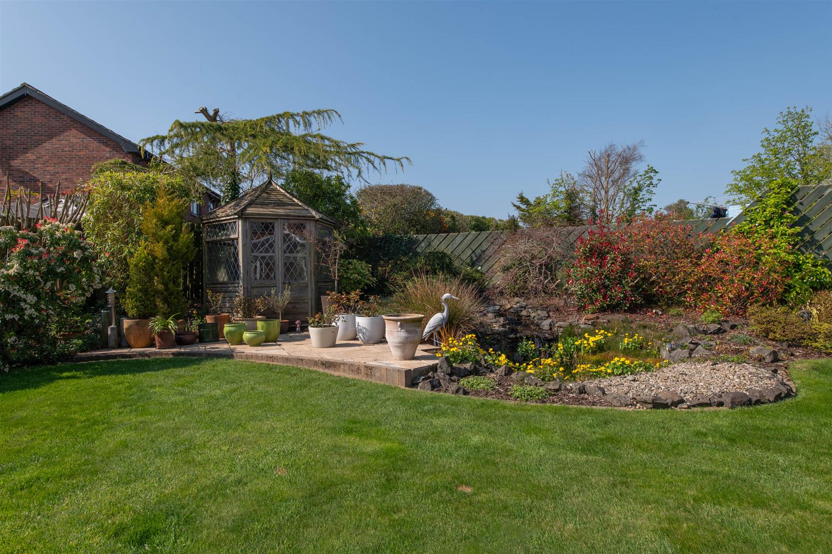 Extensive rear in lawn, plants, trees and shrubs, landscaped area, water feature, paved patio area, hot and cold external water tap and light, pond