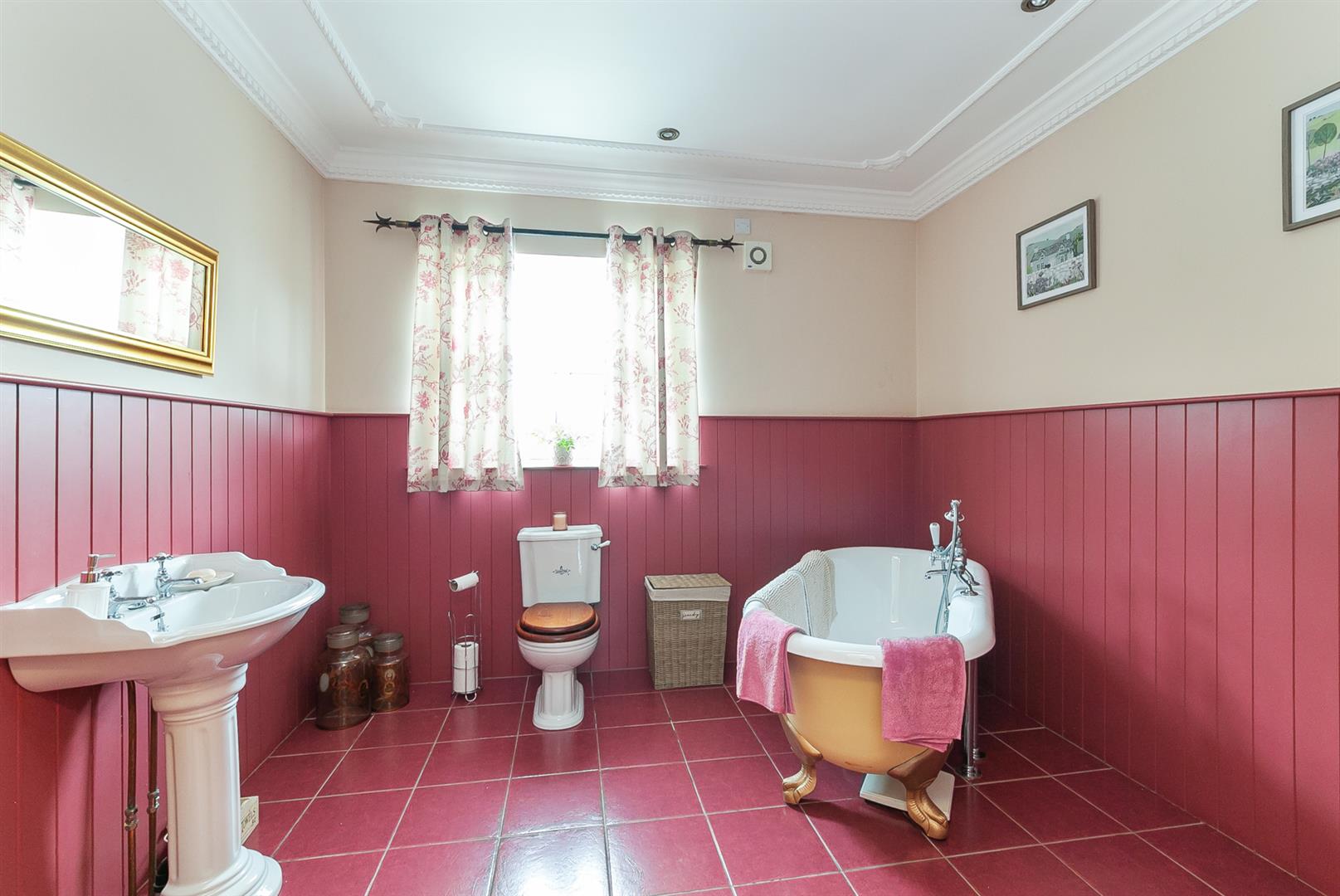 Fitted with a white three piece suite including a claw foot, freestanding bath, pedestal wash hand basin and W/C. Half panelling to walls. Tiled floor. Ceiling coving.