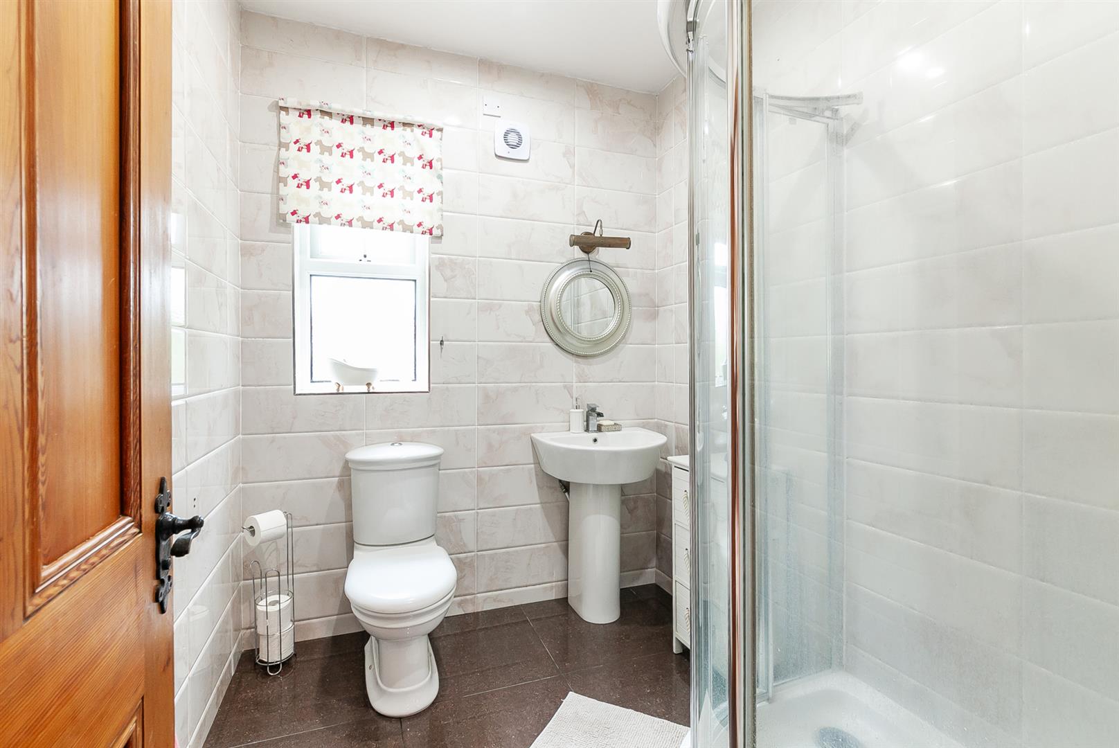 Fitted with a contemporary white, three piece suite including oversized shower enclosure, pedestal wash hand basin and W/C. Tiled floor to ceiling.
