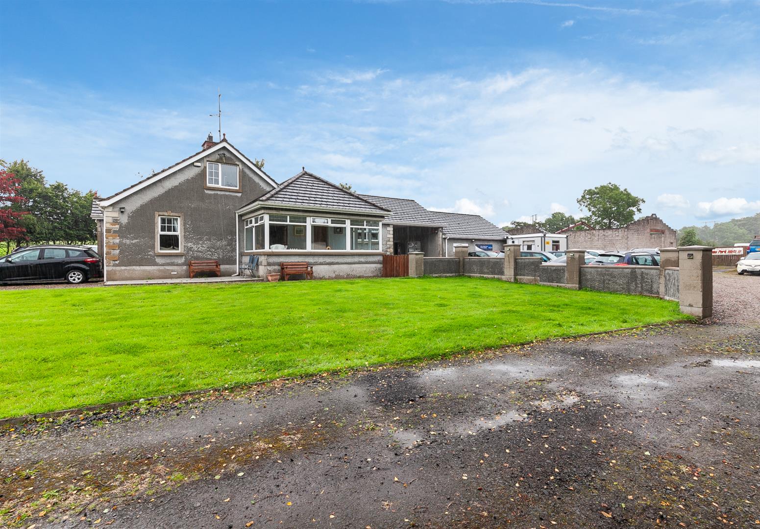 Access is via laneway from the Craigstown Road, shared with other residential dwellings. Double gates open to generous private driveway, finished in stone.