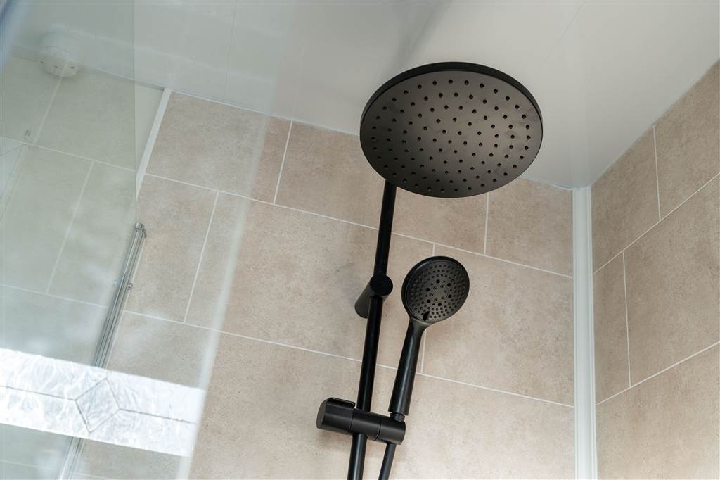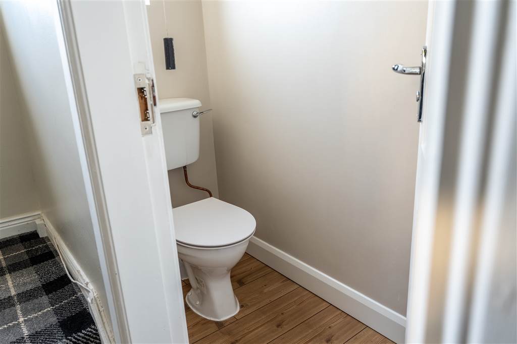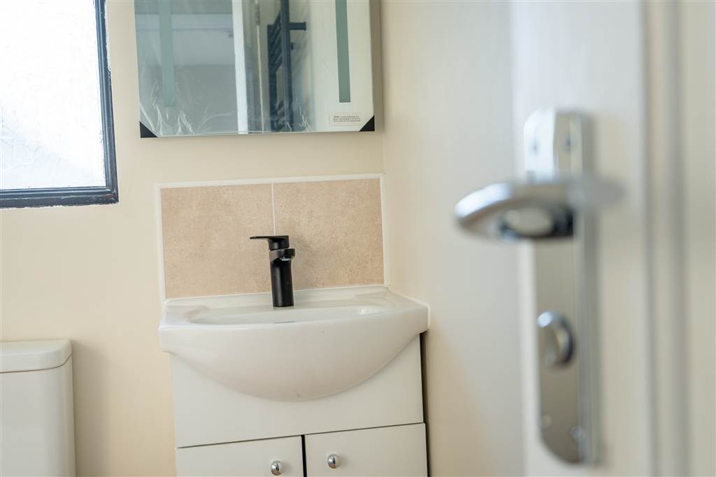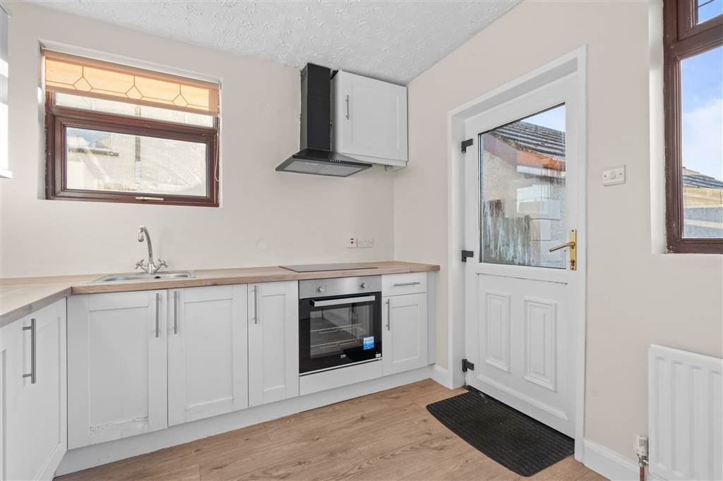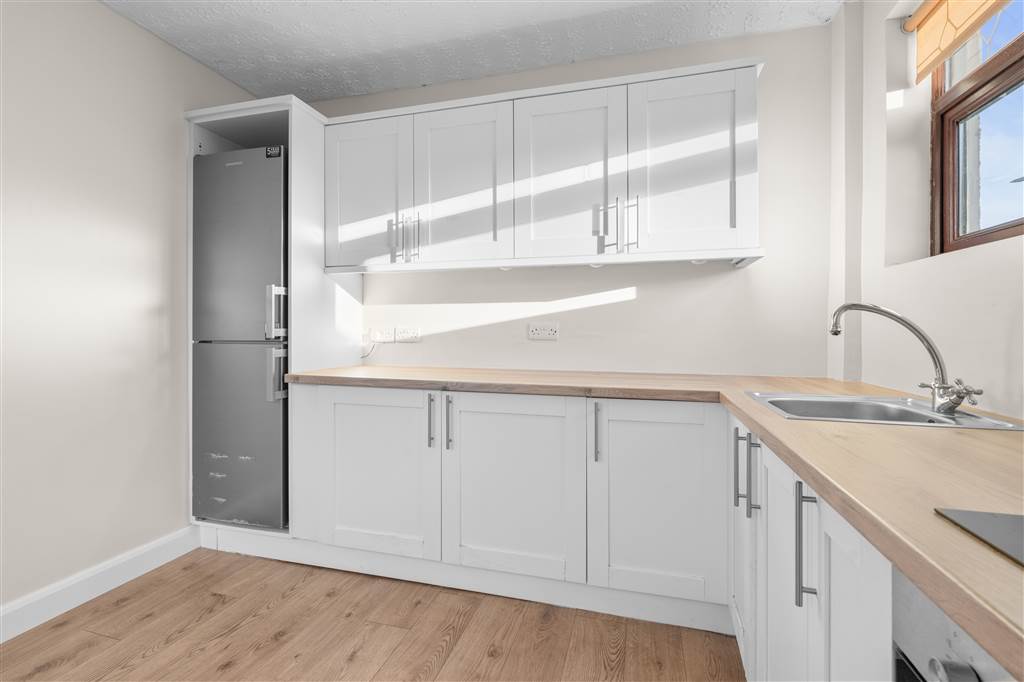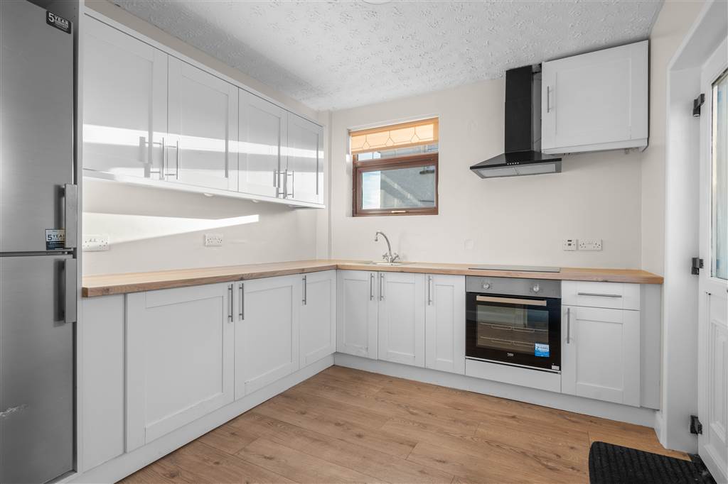 With a range of eye and low-level fitted units, stainless-steel sink unit with stainless-steel mixer tap. Integrated four ring electric hob and oven with extractor fan over. Plumbed for washing machine. Fridge-freezer. Cutlery drawer. Laminated wooden flooring. PVC door to rear.