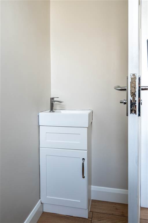 With LFWC and WHB with built-in vanity unit. Laminated wooden flooring.