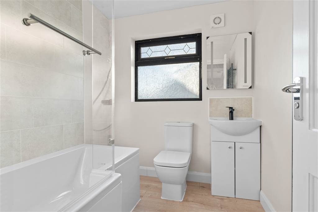 With 3-piece white suite comprising LFWC, WHB with built-in vanity unit and P-shaped bath with shower over. Laminated wooden flooring.