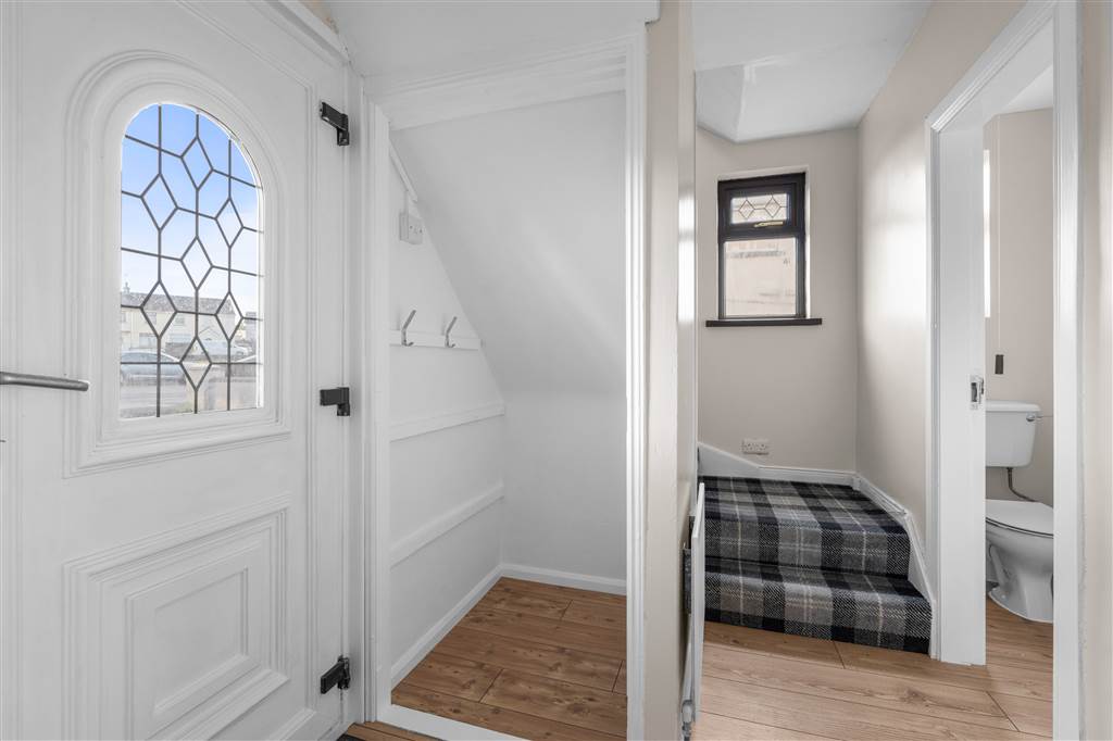 With PVC front door with decorative glazed pane. Staircase to first floor. Under stair storage cupboard. Built-in storage cupboard. Laminated wooden flooring.