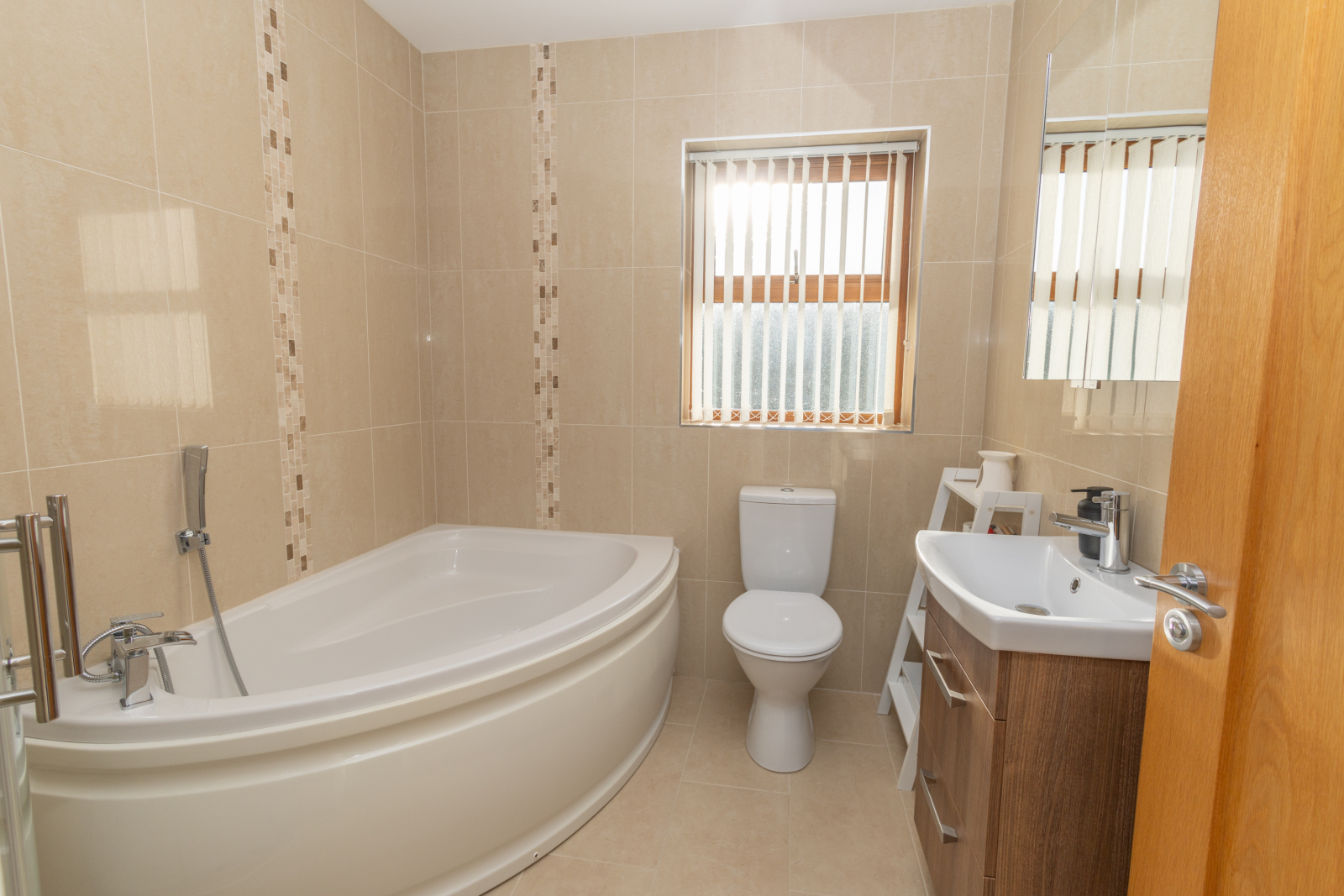 Fully tiled walls and floor; white suite with WC and wash hand basin set within a vanity unit, with wall-mounted vanity unit above; corner bath; mains-powered shower and heated towel rack.