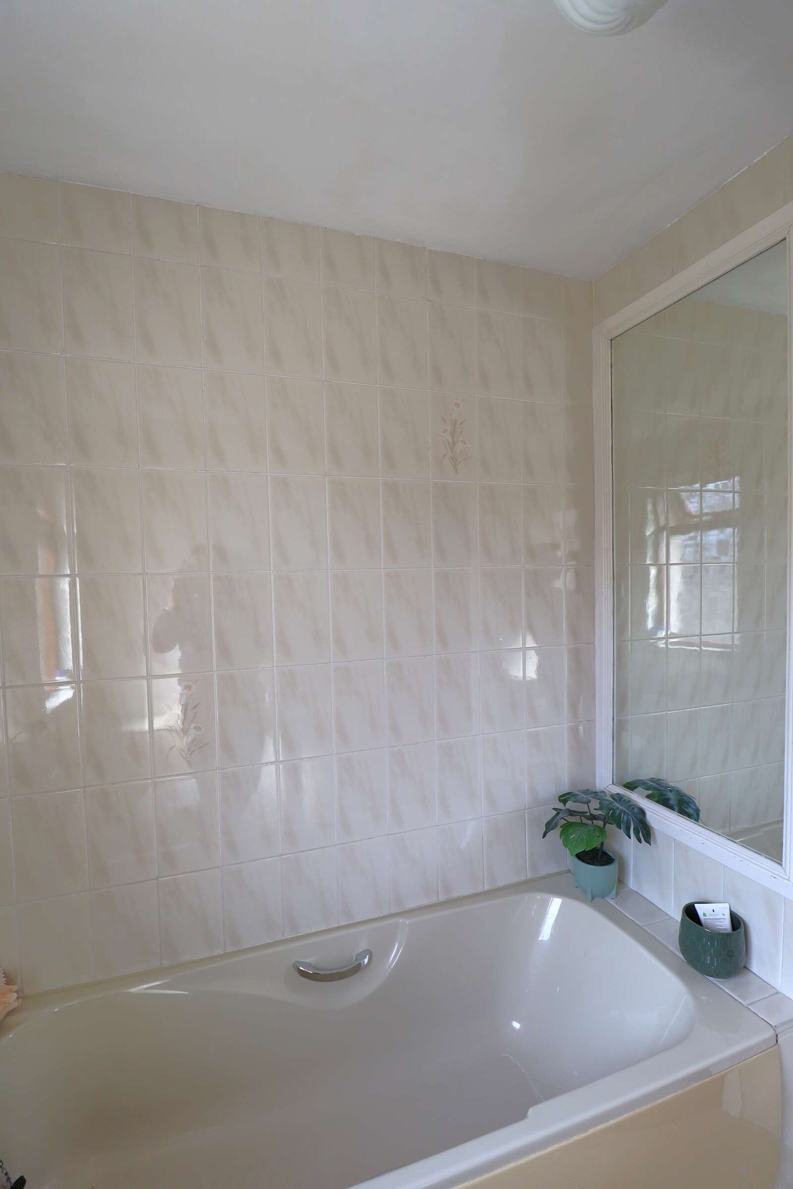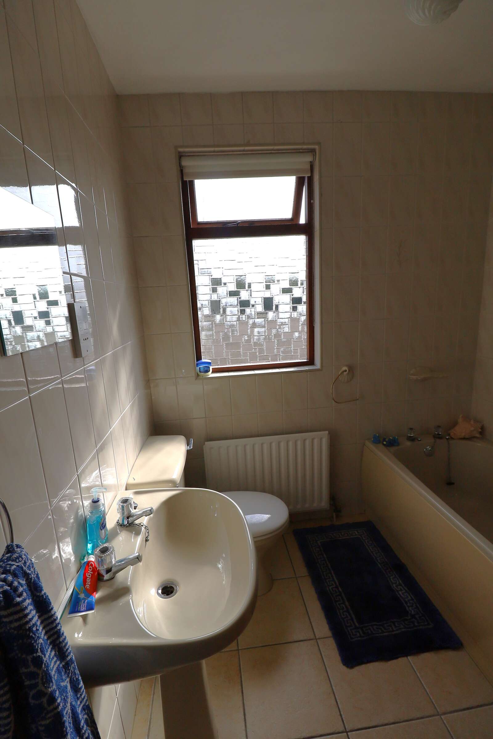 Side aspect window. Fully tiled. WC, pedestal wash hand basin and bath. Single radiator.