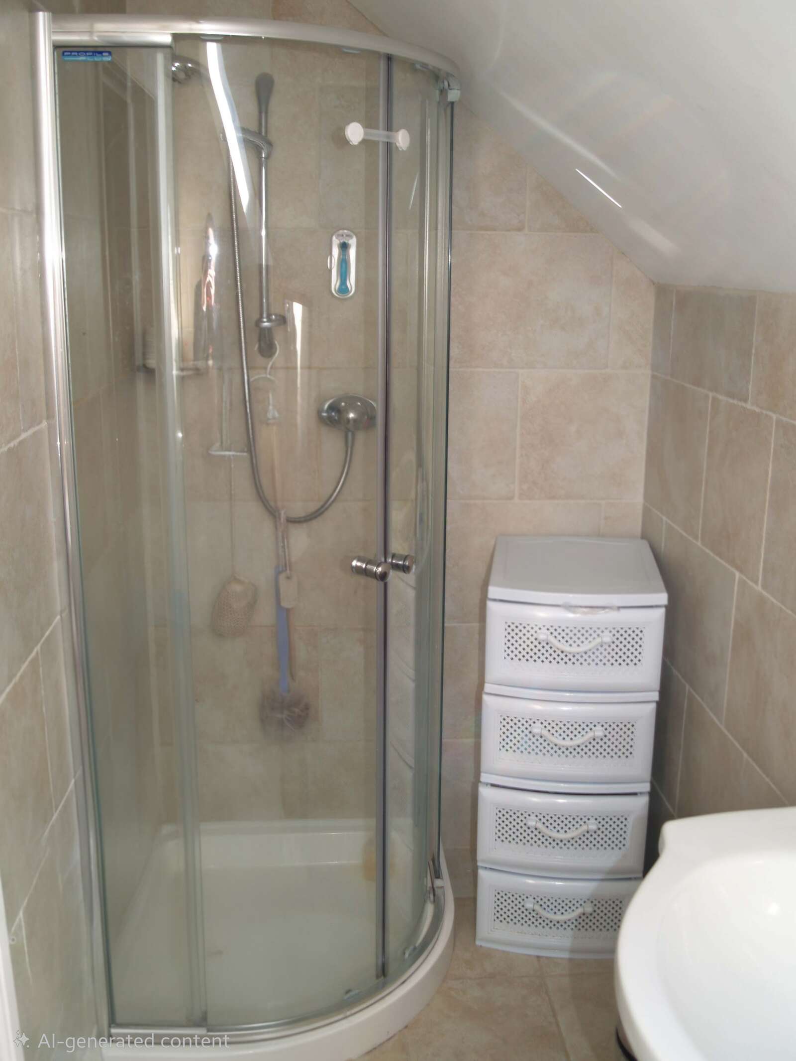 Fully tiled,. Corner shower enclosure. WC. Vanity unit. Single radiator. Shaver point. Velux window.